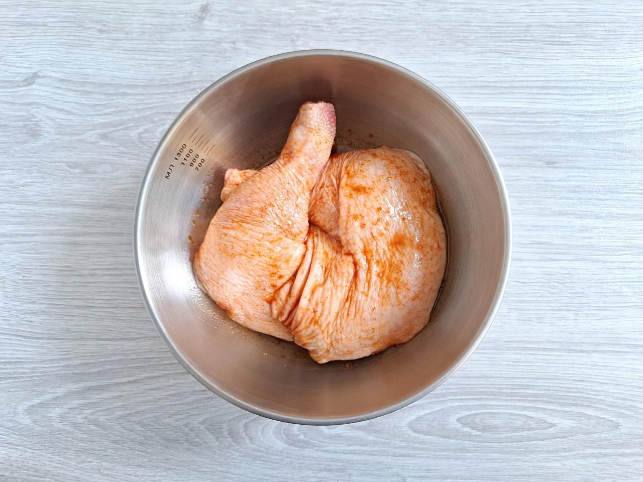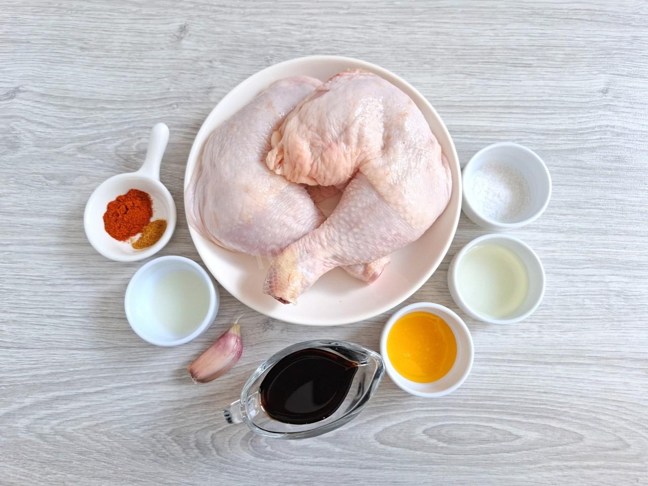 Куриные окорочка промойте в холодной воде и обсушите бумажным полотенцем. В небольшой миске соедините жидкий мед, соевый соус, лимонный сок, паприку, специи для курицы и посолите по вкусу. Чеснок очистите, промойте и пропустите через пресс. Добавьте чеснок к маринаду и все хорошо перемешайте. Курицу залейте маринадом и оставьте на столе примерно на 30 минут пропитаться.