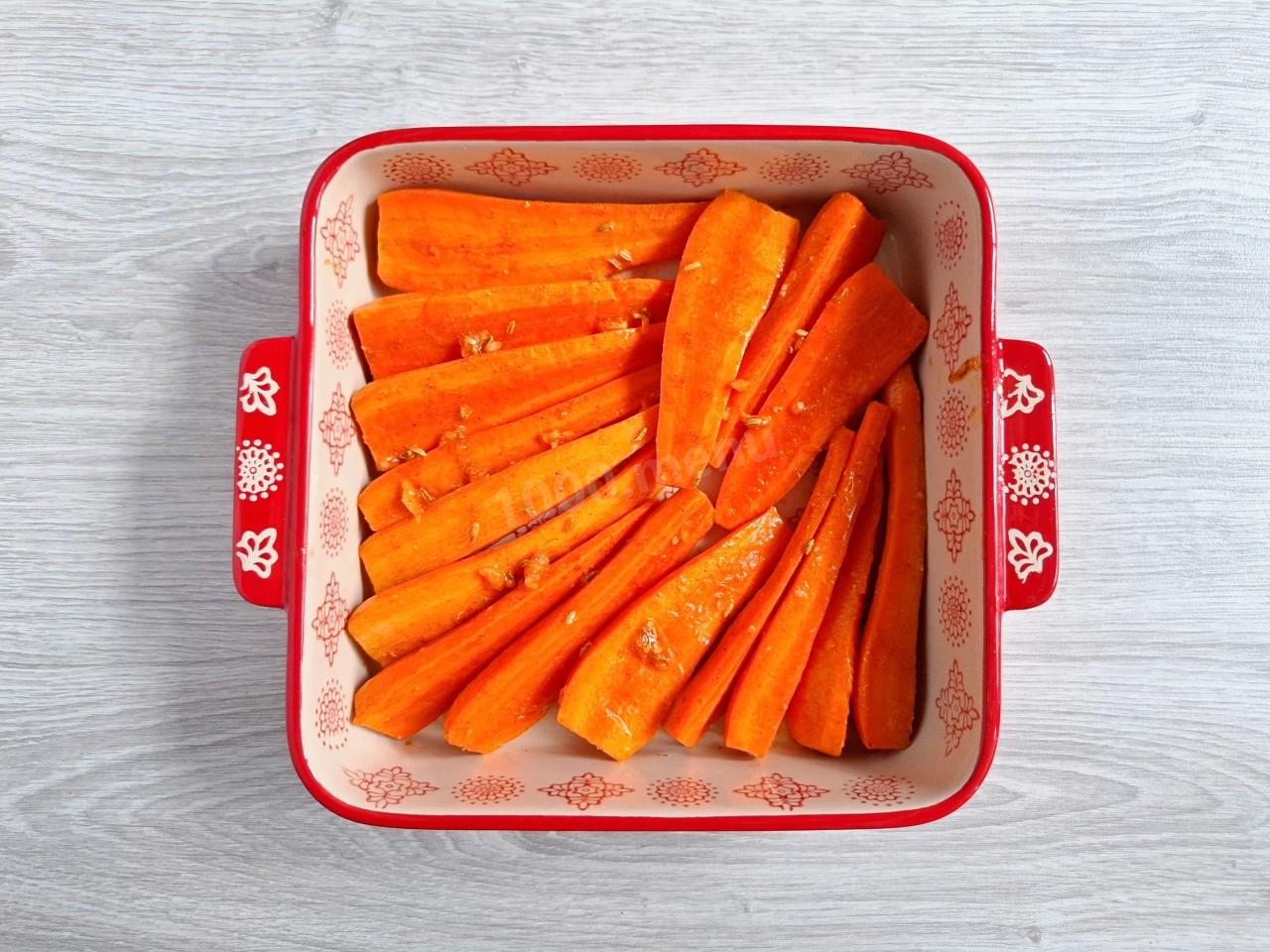 Разрежьте каждую морковку вдоль пополам или на четыре части в зависимости от толщины корнеплода. Мелкую морковь можно оставить целой. В миску с морковью влейте лимонный сок и жидкий мед, добавьте зиру, паприку и соль по вкусу. Чеснок пропустите через пресс или мелко порубите ножом. Добавьте чеснок и мягкое масло. Все тщательно перемешайте.