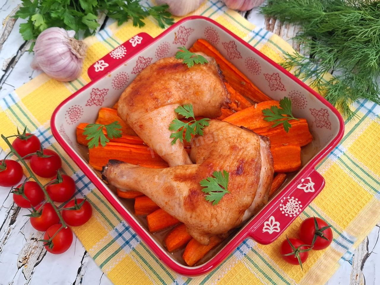 Выложите морковь в форму. На слой моркови выложите подготовленные части курицы. Кусочки чеснока лучше убрать с поверхности курицы, чтобы они не подгорели. Поставьте форму в заранее разогретую до 170 градусов духовку и выпекайте около 40 - 50 минут. Время зависит от особенностей работы вашей духовки и готовности моркови и курицы. О том, как подобрать форму, а также об особенностях духовок вы можете прочитать в статье по ссылке после описания рецепта.