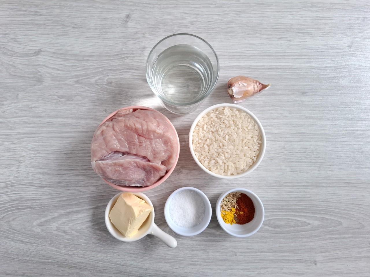 Подготовьте необходимые продукты. Выбирайте свежую свинину с небольшим количеством жира. Подойдет любой вид мяса. Если оно замороженное, предварительно разморозьте его на нижней полке холодильника. Количество чеснока и специй берите на свой вкус. Сливочное масло выбирайте натуральное и качественное без растительных добавок. Рис берите длиннозерный или для плова, сечка не подойдет.