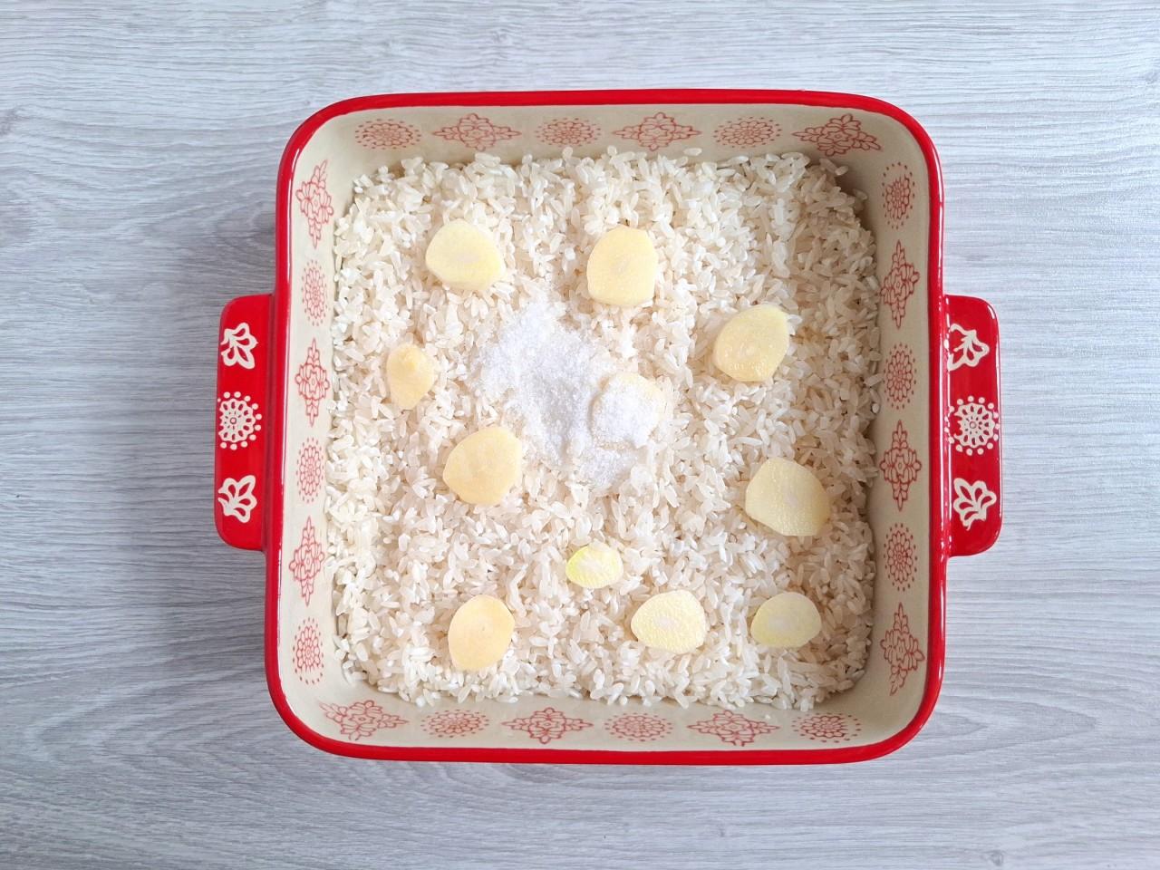 Хорошо промойте рис до прозрачной воды, затем воду слейте. Выложите рис в форму для выпечки. Чеснок очистите от шелухи и нарежьте его на пластинки или маленькие кусочки. Добавьте соль и все перемешайте. О том, как подобрать форму и о тонкостях выбора риса читайте в статье по ссылке в конце рецепта.