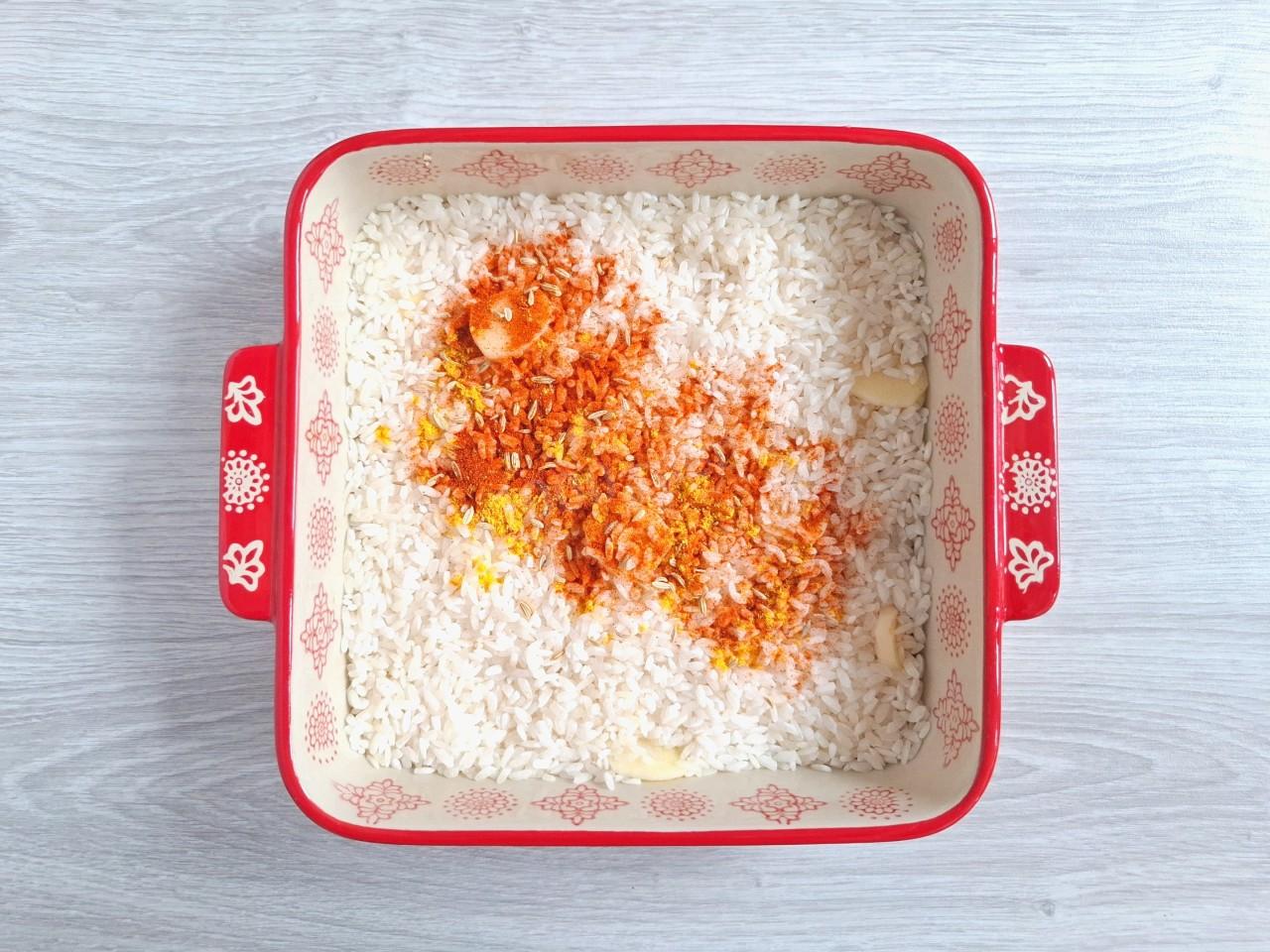 Добавьте к рису паприку, куркуму и зиру. Все перемешайте. На этом этапе вы можете взять любые специи по своему желанию и вкусу. Какие ещё специи идеально подойдут для риса читайте в конце рецепта.