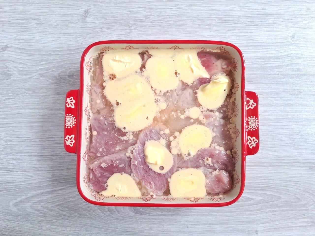Свинину промойте в холодной воде и обсушите бумажным полотенцем. Нарежьте мясо тонкими ломтиками. Прикройте мясо пищевой пленкой и слегка отбейте кулинарным молотком. Посолите и поперчите ломтики по своему вкусу. Выложите мясные ломтики поверх подушки из риса. Сливочное масло нарежьте небольшими кусочками и разложите сверху. Вскипятите воду и влейте нужное количество в форму. Форму накройте крышкой или плотно затяните фольгой.