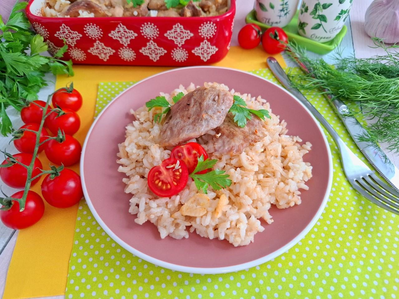 Свинину с рисом в духовке подавайте в горячем виде, разложив по тарелкам. Украсьте блюдо свежей зеленью и овощами. Дополнительно можно предложить сметанный или томатный соус. Приятного аппетита!