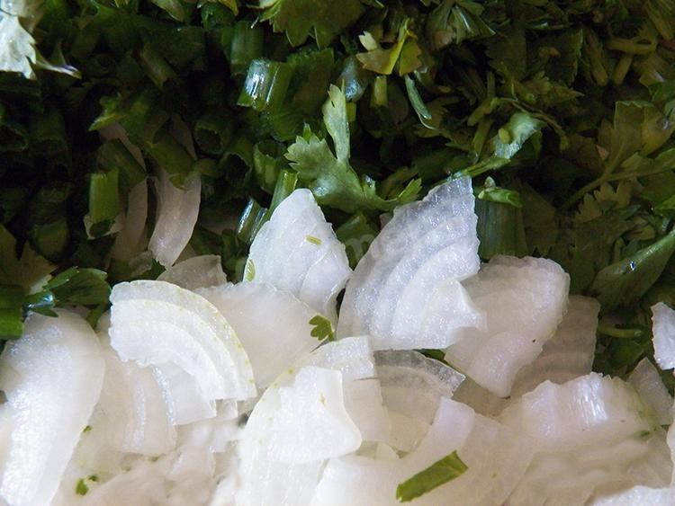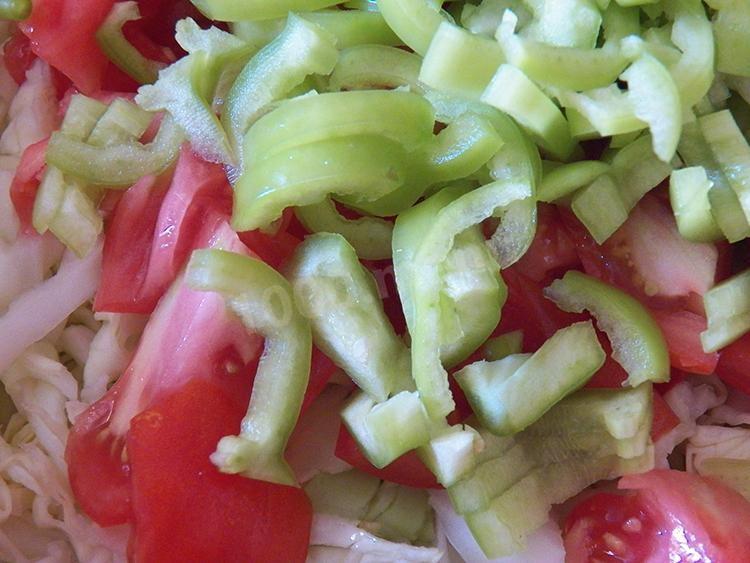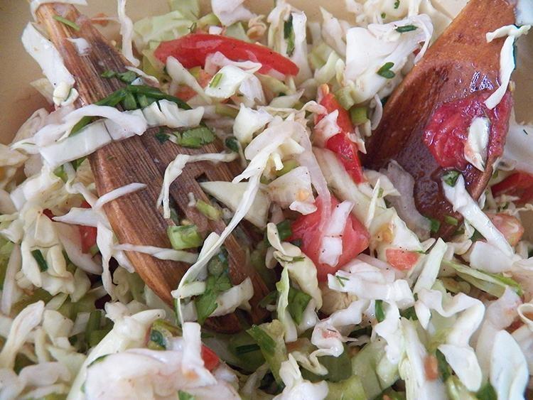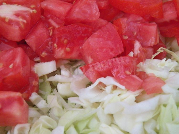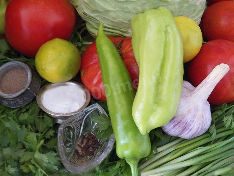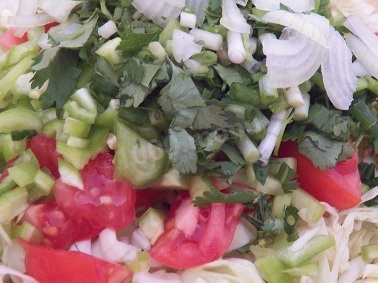 Нарезать капусту, репчатый лук, острый и болгарский перец тонкой соломкой, помидоры - кубиками. Все овощи поместить в большую миску, добавить мелко нарезанную зелень, протертый чеснок, гвоздику, черный перец, соль и полить соком лайма. Тщательно перемешать (но не перетирать!) и поставить в холодильник как минимум на час.