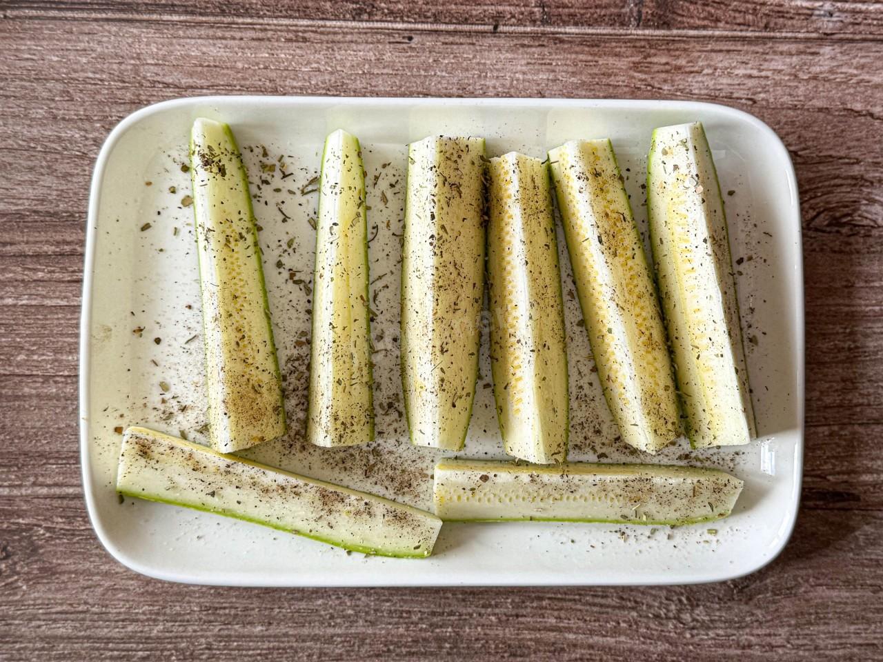 У кабачков отрежьте хвостики. Разрежьте кабачки на небольшие продолговатые кусочки вдоль. У меня кабачок достаточно длинный, поэтому я каждый кусочек разрезала еще пополам. Посолите, поперчите и добавьте специи по вкусу. Я посыпала кабачки прованскими травами. Дополнительно можно добавить свои любимые специи, а какие лучше всего подойдут именно для этого блюда, читайте в статье, ссылка под рецептом.