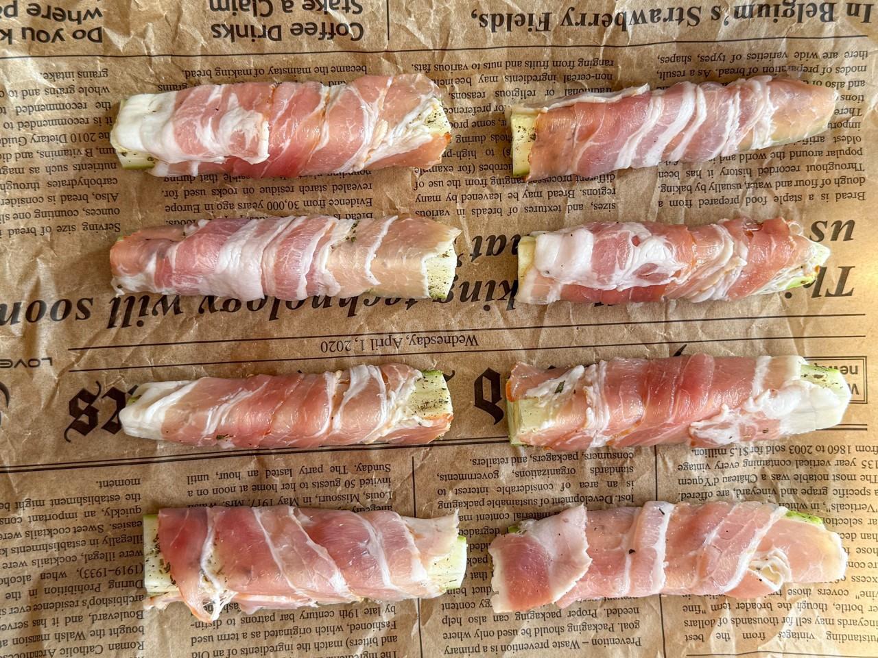 Каждую полоску кабачка плотно обверните в полоску бекона и выложите на противень с пергаментной бумагой. О том, какой лучше выбрать пергамент, читайте в статье под рецептом. Запекайте кабачки в беконе примерно 15-20 минут при 180℃ до румяной корочки. Учтите, что время приготовления и температура могут отличаться в зависимости от вашей духовки. Об особенностях работы духовок читайте в статье, ссылка под рецептом.