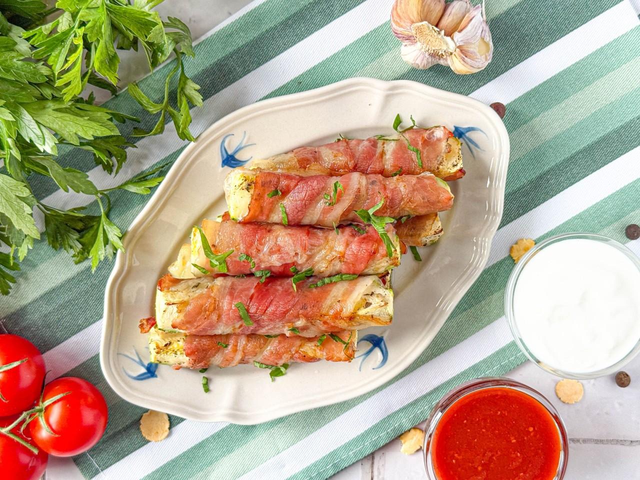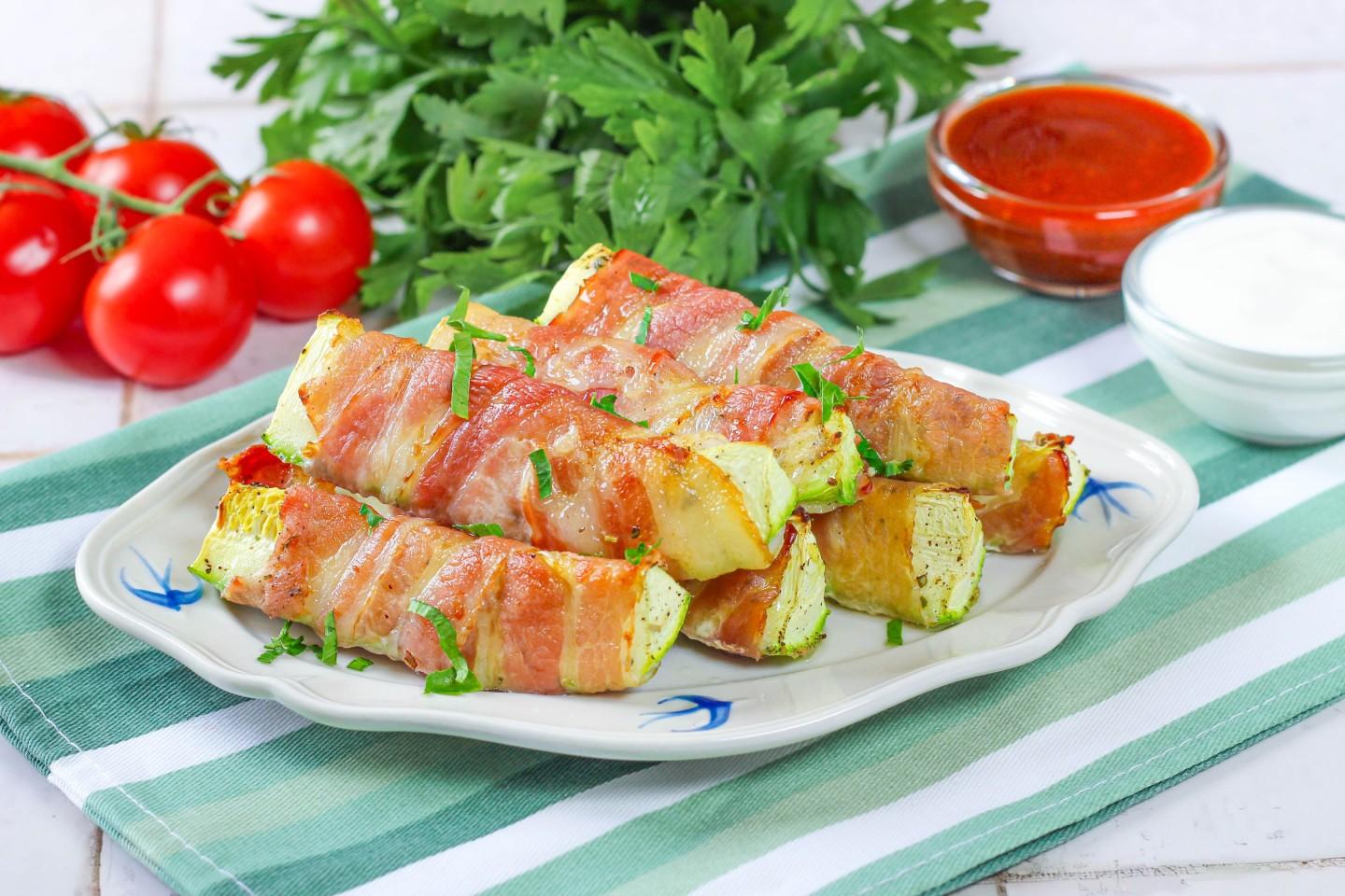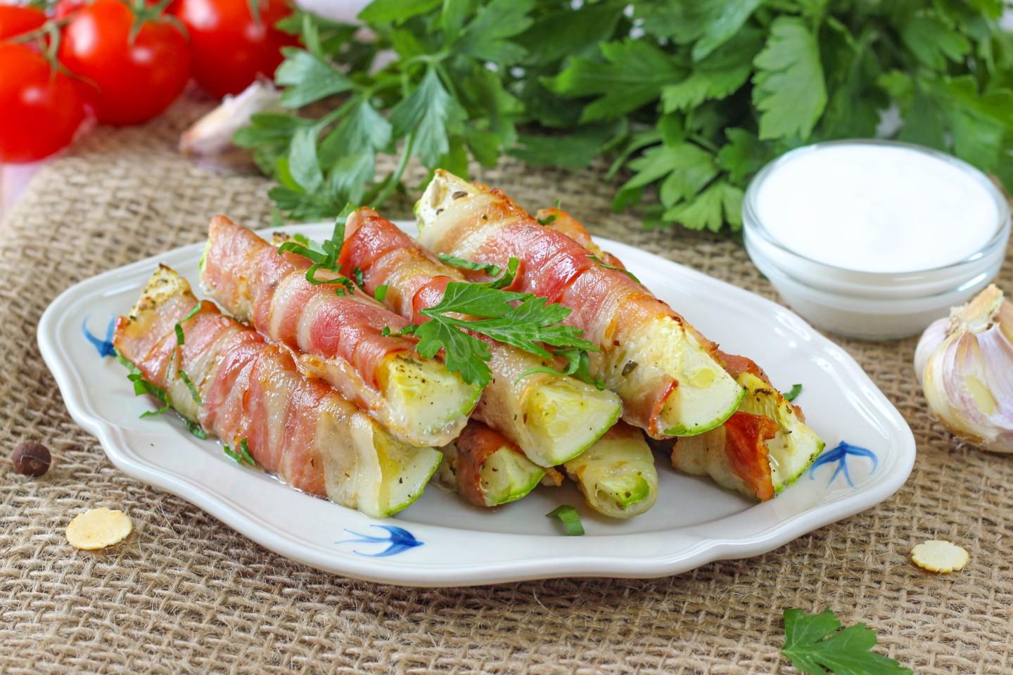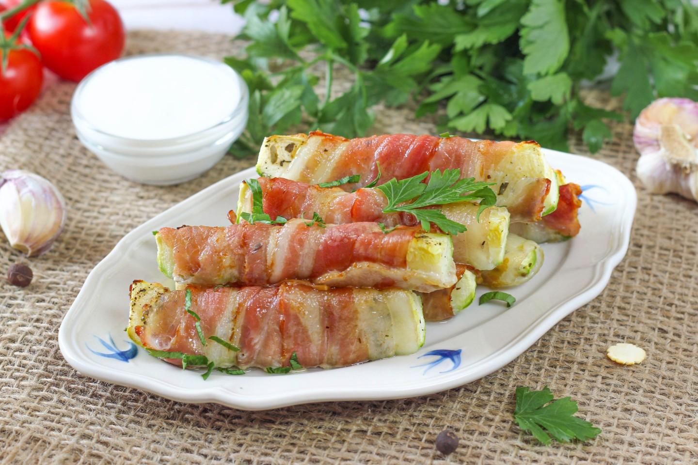 Готовые кабачки в беконе сразу же подавайте к столу, чтобы они не успели остыть. Закуска отлично сочетается со сметаной, чесночным или острым томатным соусом. Можно посыпать тёртым сыром перед подачей. Приятно аппетита!