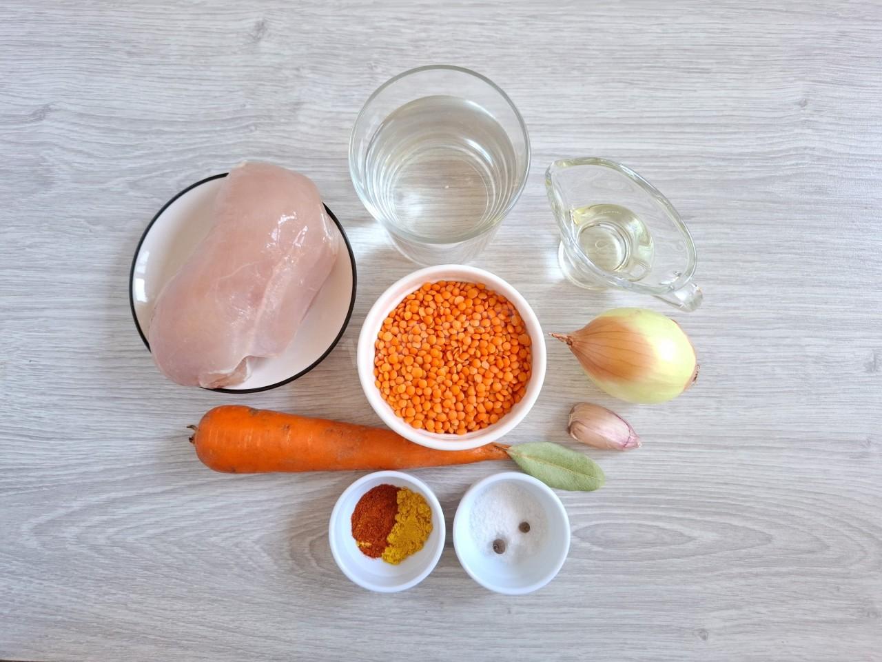 Подготовьте все необходимые ингредиенты Подойдет не только грудка, но и филе бедра или индейка. Если мясо заморожено, предварительно разморозьте его на нижней полке холодильника. Кроме красной чечевицы подойдут и другие сорта. Также можете взять фасоль или горох. Количество чеснока и специй берите по своему вкусу. О секретах и тонкостях приготовления различных видов супов вы можете прочитать в статье по ссылке после описания рецепта.