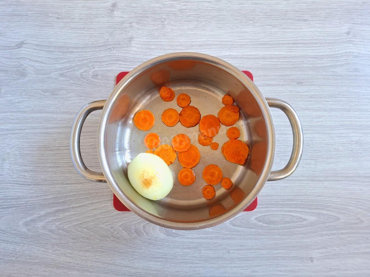 Морковь вымойте и очистите от кожуры, затем нарежьте кружками. Луковицу очистите от шелухи. Кастрюлю с толстым дном поставьте на плиту, влейте растительное масло и разогрейте на среднем огне. Обжарьте луковицу и нарезанную морковь около 4 - 5 минут до золотистого цвета. Время будет зависеть от особенностей работы вашей плиты и готовности овощей. О том, как подобрать кастрюлю читайте в статье по ссылке под описанием рецепта.