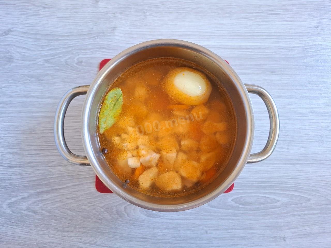 В кастрюлю добавьте лавровый лист, паприку, куркуму, горошины перца и посолите по вкусу. Вскипятите чистую воду и влейте нужное количество в кастрюлю. Количество воды зависит от объема кастрюли и ваших предпочтений. Доведите суп до кипения, затем сделайте нагрев ниже среднего. Кастрюлю прикройте крышкой, но не до конца.