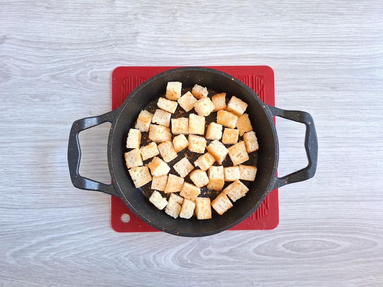 Для этого нарежьте хлеб небольшими кубиками и подсушите на сухой сковороде до легкого румянца. Можно сделать сухарики в духовке или взять готовые. С выбором сковороды вам поможет статья по ссылке под описанием рецепта.