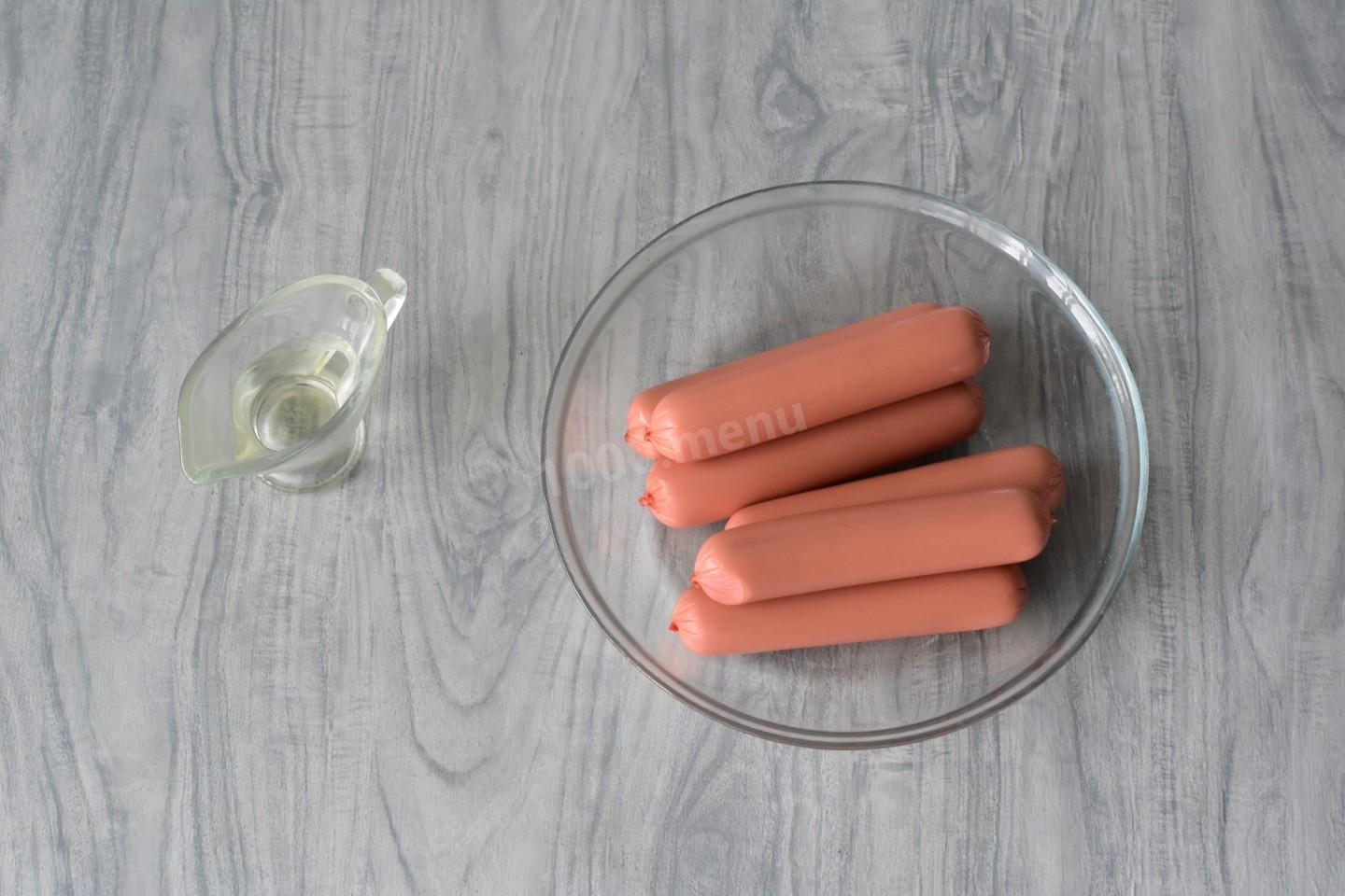 Подготовьте необходимые ингредиенты. Сосиски для блюда можете использовать любые или заменить их на сардельки. Но стоит учитывать, что они могут сильно повлиять на итоговый вкус блюда. Например, если возьмете сосиски с ярко выраженным копченым вкусом, то и все блюдо будет с легким вкусом копченостей. Если вам нужен нейтральный вкус, берите обычные сосиски, например молочные или сливочные. Растительное масло можете использовать любое, у меня подсолнечное.
