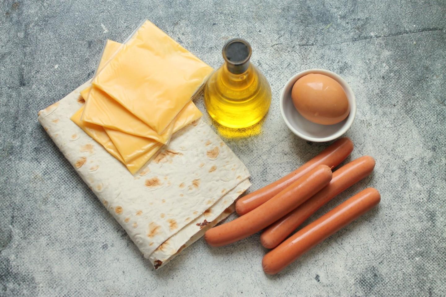 Подготовьте все необходимые ингредиенты для приготовления. Сыр подойдет любой в пластинках, который будет хорошо плавиться. Сосиски можно взять любые, без натуральной оболочки. Обязательно вымойте яйцо, ведь при видимой чистоте на нем могут остаться грязь и бактерии. Включите духовку разогреваться до температуры 180 градусов.