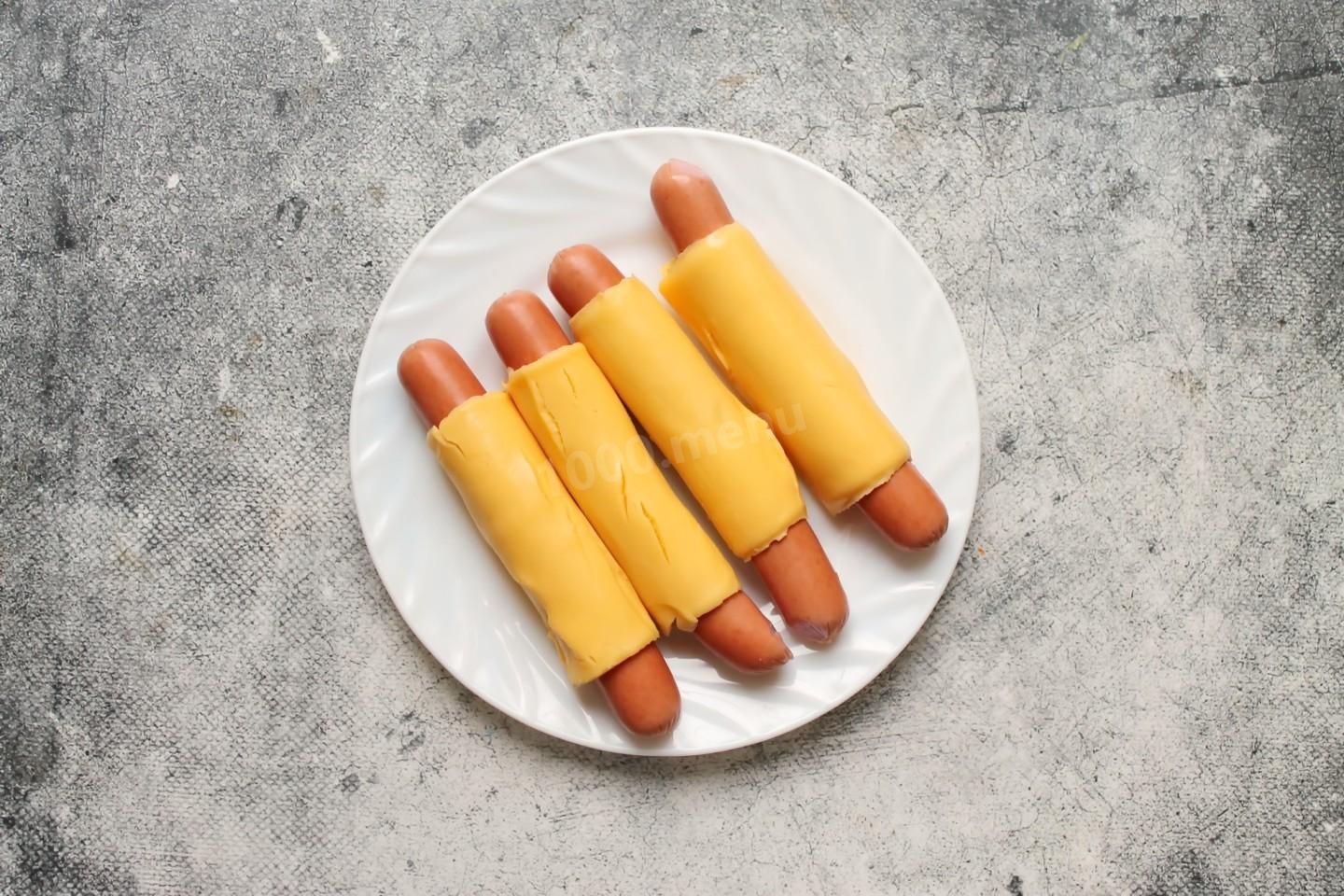 С сосисок и сыра снимите пленки и каждую сосиску обверните одной пластинкой сыра. Немного прижмите сыр, чтобы он зафиксировался.