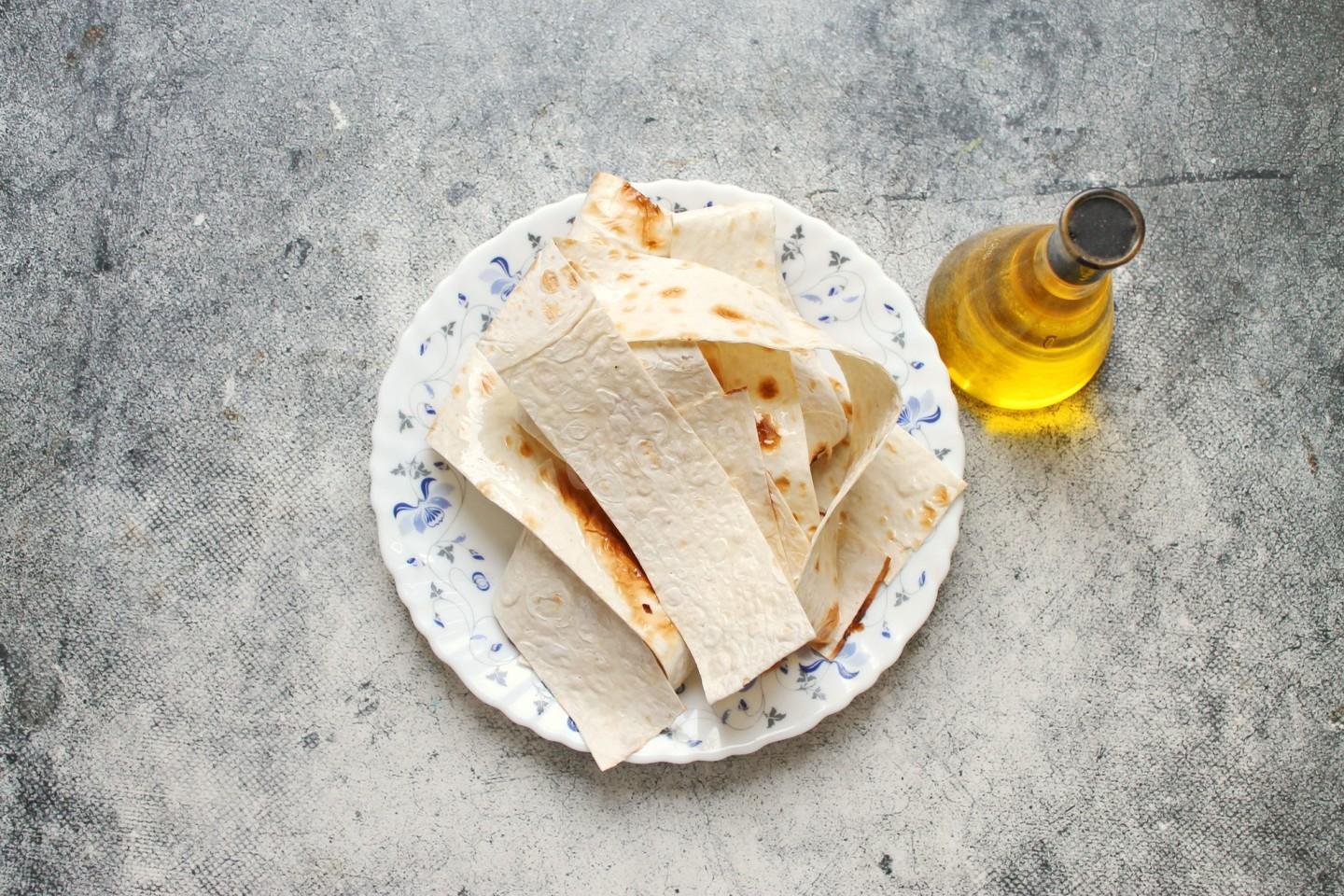 Лаваш нарежьте на полоски шириной 2-2.5 сантиметра по длинной стороне. Каждую полоску смажьте растительным маслом с одной стороны.
