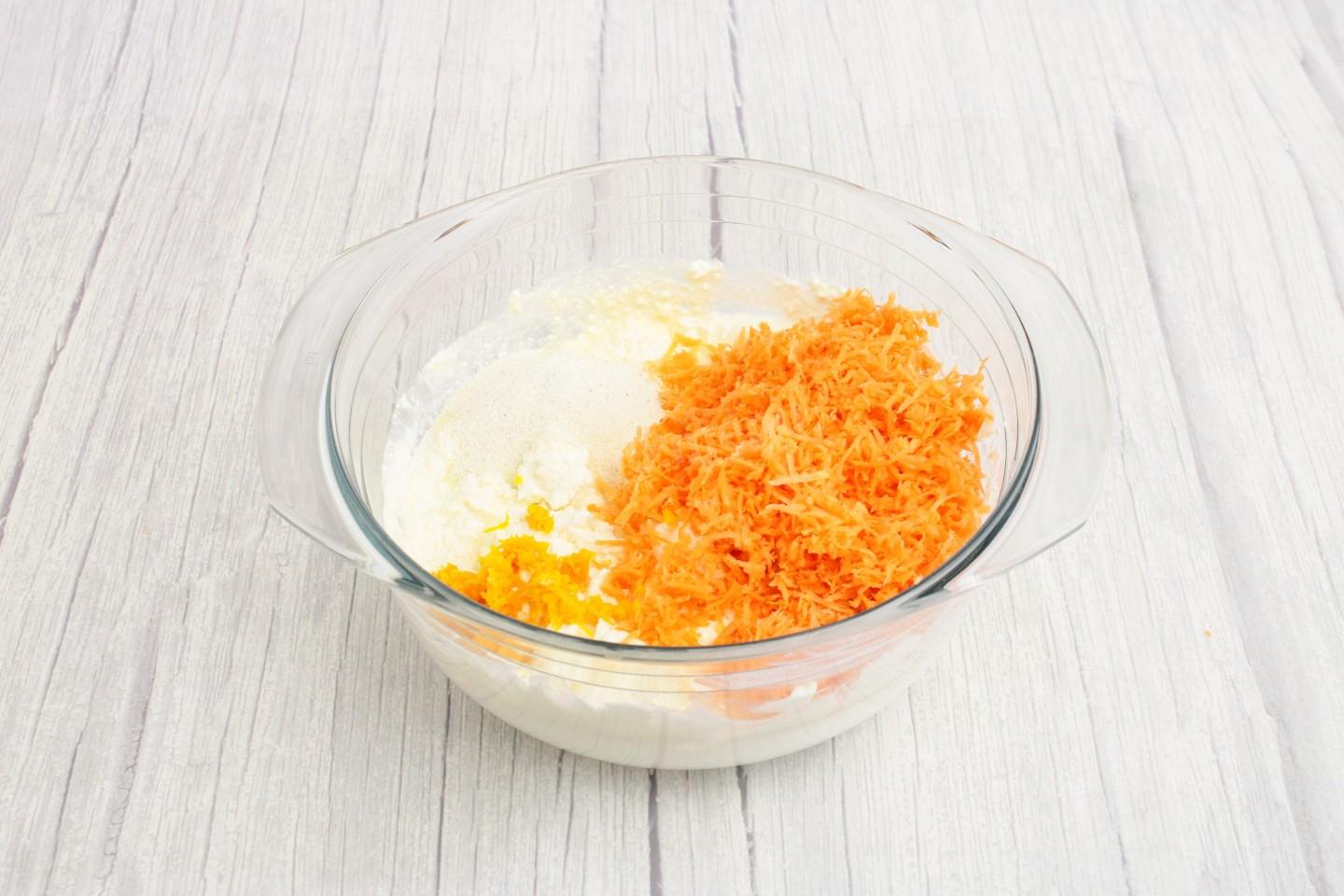 Морковь очистите, помойте, обсушите. Натрите морковь на мелкой терке. В творожную массу выложите морковь, апельсиновую цедру и манную крупу. Массу перемешайте и оставьте на 15 минут, чтобы манка набухла.