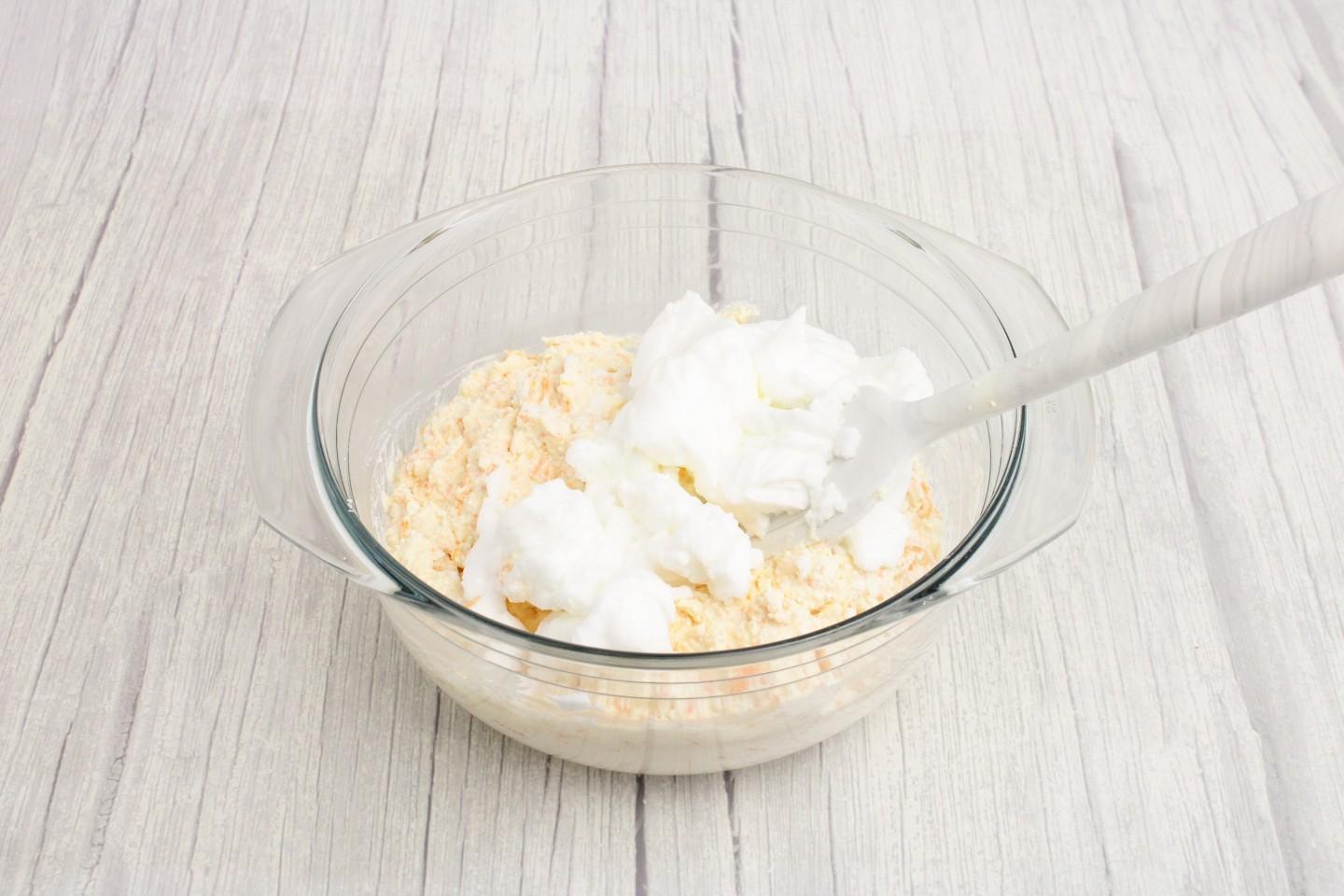 Взбейте белки в сухой, чистой емкости сначала на небольшой скорости миксера до мягкой пены. Постепенно, увеличивая обороты миксера до максимальных, взбейте белки до устойчивых пиков. Введите частями взбитые белки в творожную массу, аккуратно перемешивая лопаткой. Как правильно взбить белки можно узнать из статьи по ссылке после описания шагов. Форму для запекания смажьте небольшим количеством растительного масла.