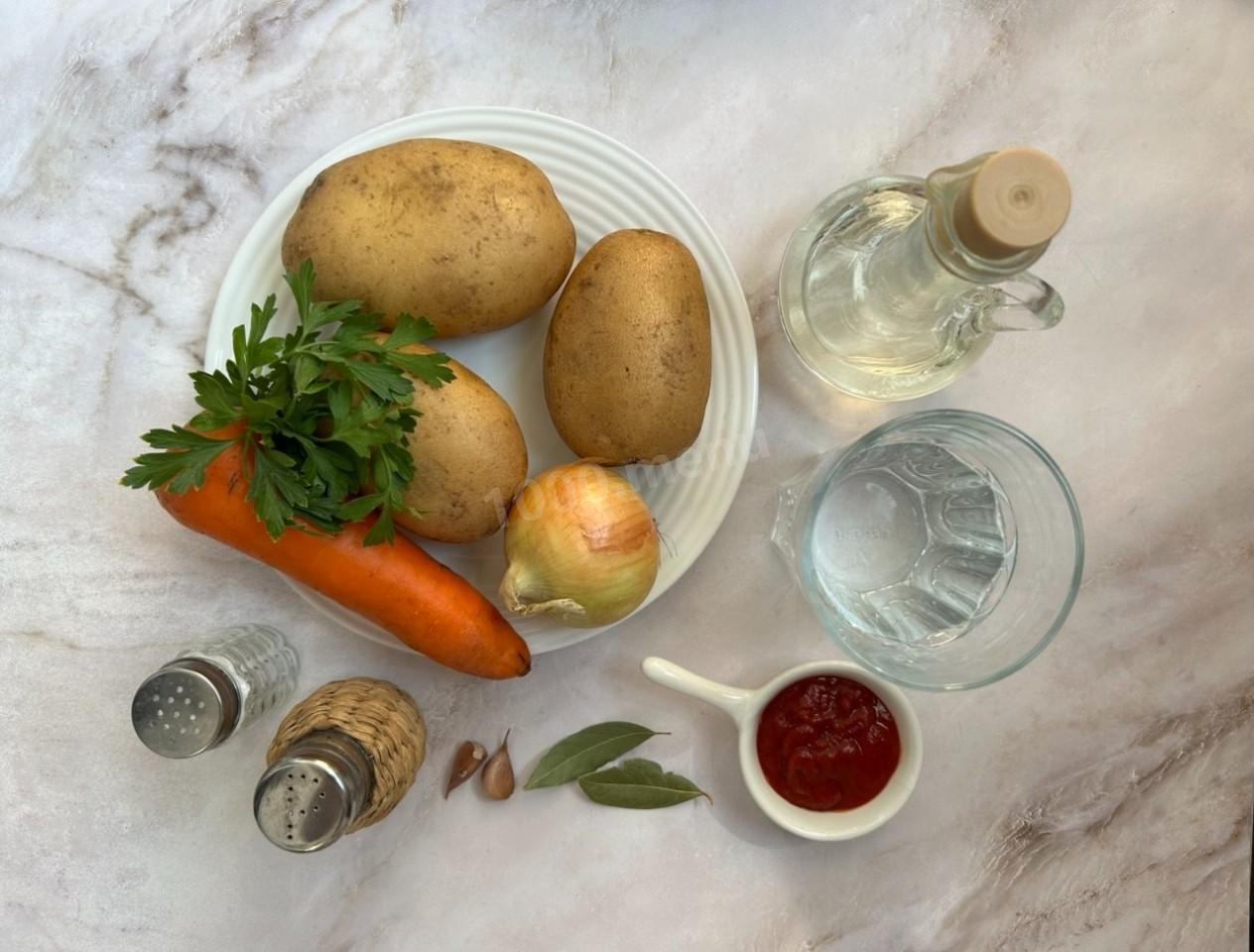 Как сделать тушеную картошку с томатной пастой? Для начала подготовьте все необходимые ингредиенты по списку. Очистите картофель, лук и морковь. Нарежьте картофель кубиками среднего размера. Лук мелко порубите ножом. Морковь натрите на крупной терке.