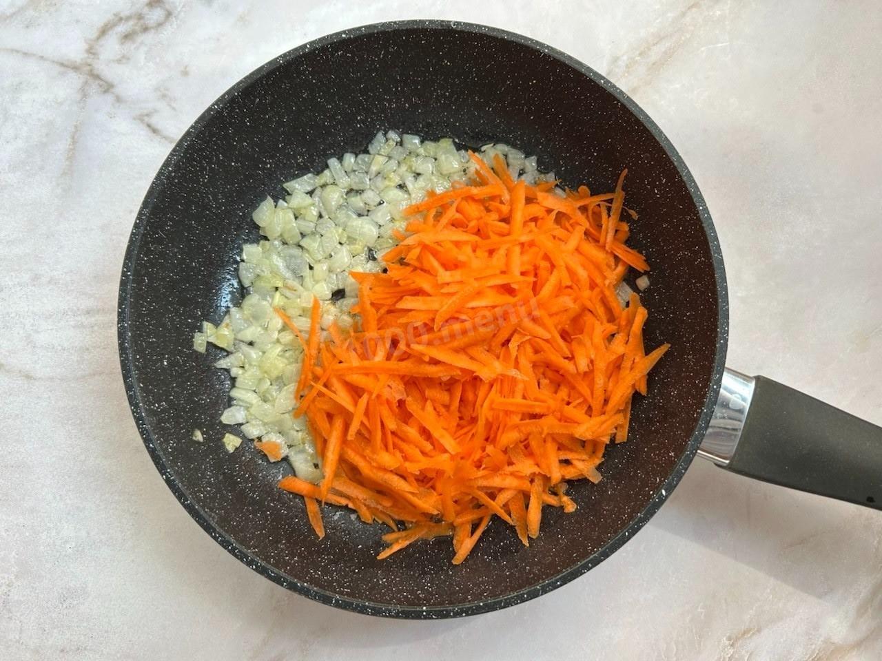 Разогрейте сковороду с растительным маслом на среднем огне. Обжарьте лук до прозрачного цвета около 3 минут. Добавьте морковь и продолжайте обжаривать еще 5–7 минут, пока овощи не станут мягкими. С выбором сковороды и масла для жарки помогут статьи по ссылкам в конце рецепта.