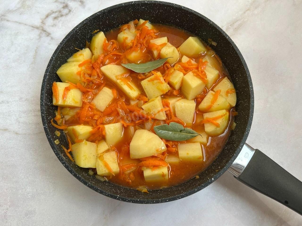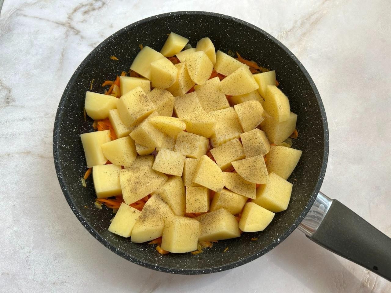 Когда лук и морковь станут мягкими, добавьте нарезанный картофель, посыпьте блюдо солью и перцем по вкусу. Все хорошо и перемешайте.