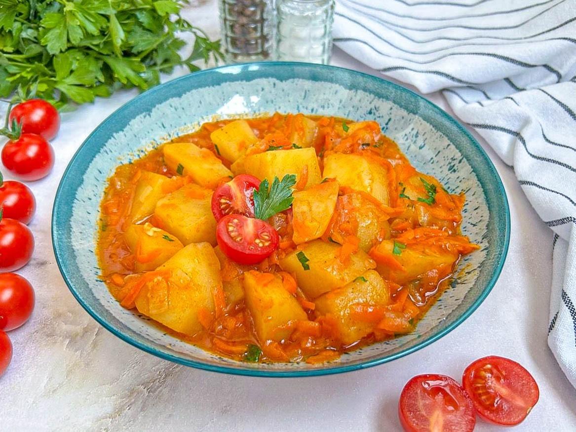 Добавление томатной пасты не только для вкуса. Кислота, содержащаяся в помидорах, не дает картофелю развариться, помогая ему сохранять форму.