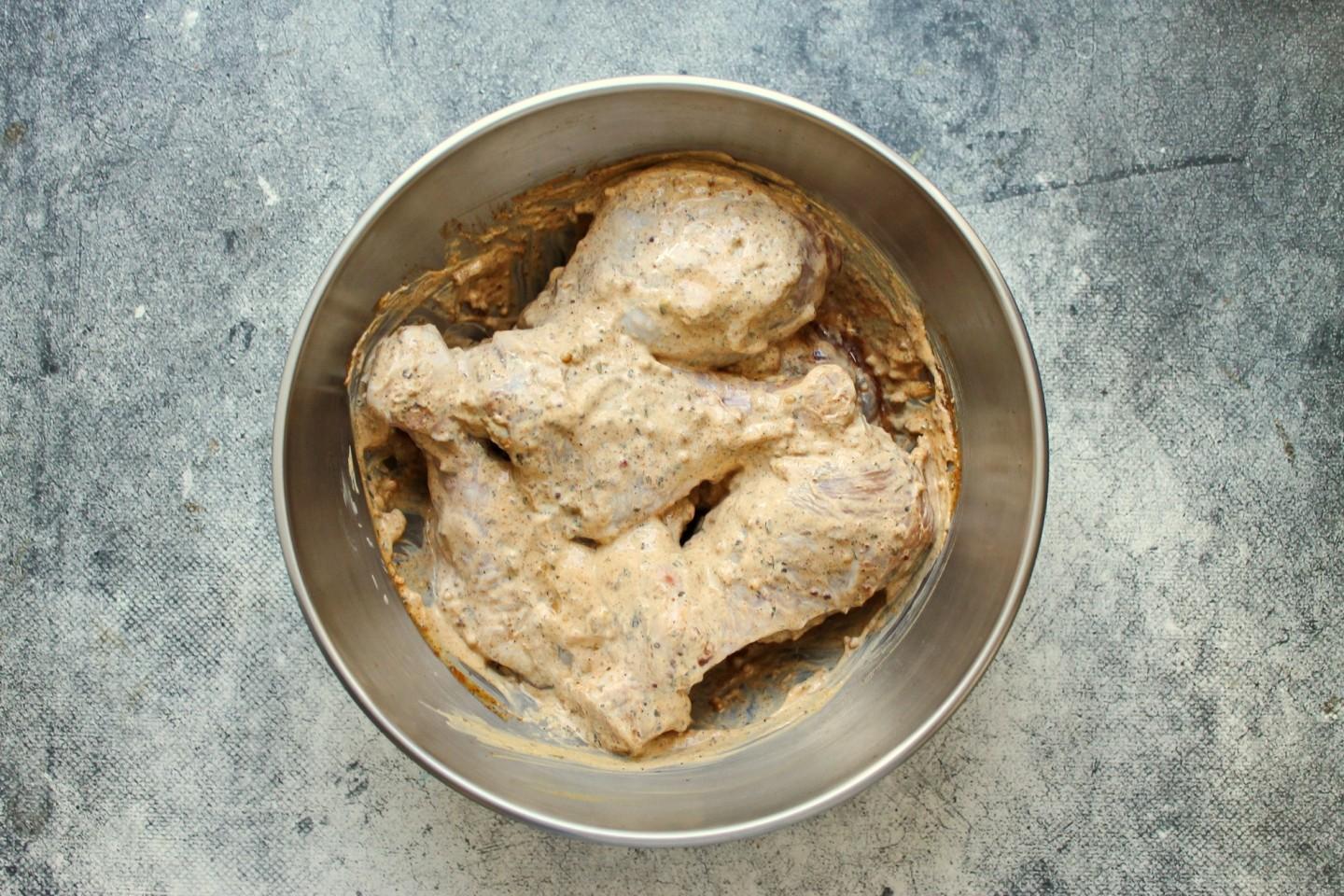 Ножки положите в миску добавьте майонез, горчицу, паприку, базилик, посолите и поперчите. Все хорошо перемешайте, чтобы курица было полностью покрыта маринадом. Накройте миску крышкой или затяните пищевой пленкой и уберите в холодильник на один час. Майонез я использовала магазинный, но его просто сделать дома. Рецепты можно посмотреть под шагами.