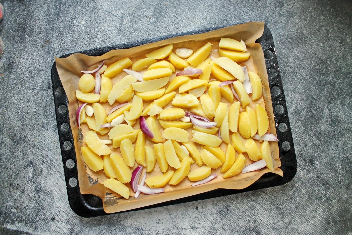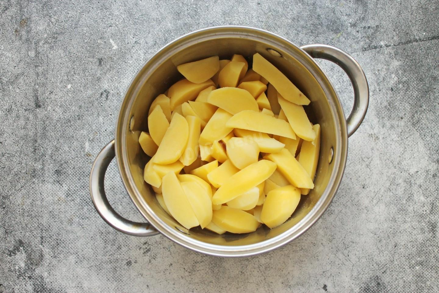 Картофель порежьте на дольки. Если боитесь, что картофель не пропечется, то предварительно отварите его в соленой воде на среднем огне в течение 7-10 минут до полуготовности. Затем откиньте картошку на сито, чтобы стек отвар. Какой сорт картофеля лучше всего взять для запекания можно прочитать в статье под рецептом.