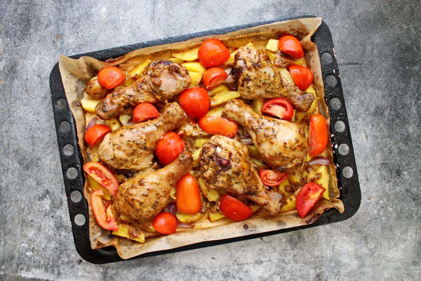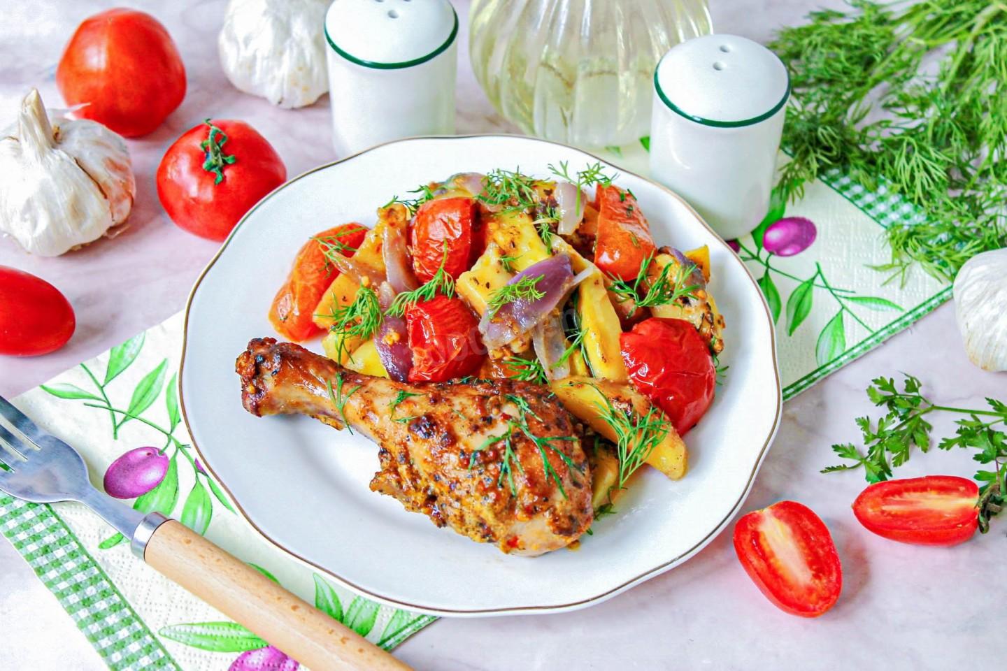 Помидоры разрежьте на крупные дольки и разложите их на картофель между ножками. Верните противень обратно в духовку и запекайте еще 15-20 минут до готовности. Точное время будет зависеть от особенностей работы вашей духовки. Подробнее об этом читайте в конце рецепта. Вкусные куриные ножки с картошкой готовы.