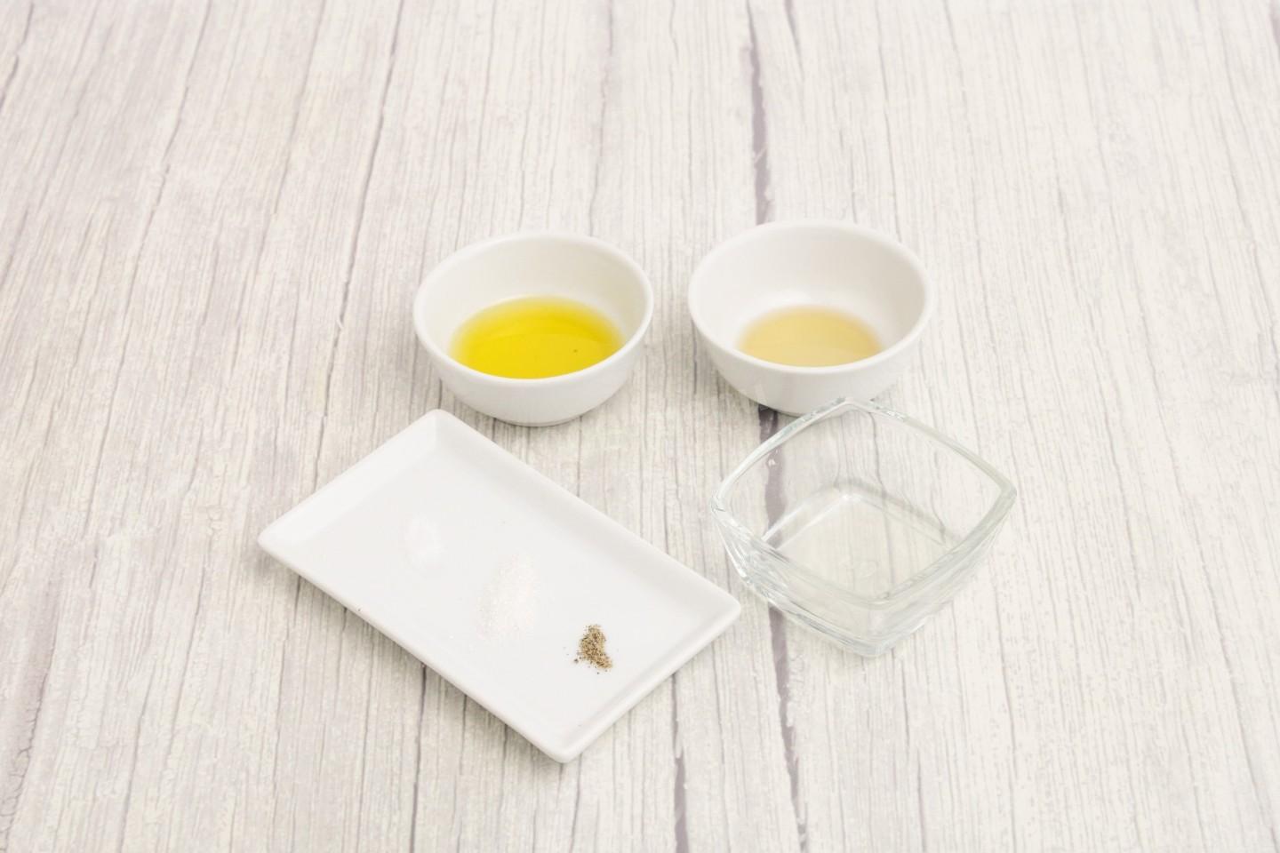 Подготовьте ингредиенты для салатной заправки. Оливковое масло можно заменить растительным маслом без запаха. В маленькой мисочке соедините оливковое масло, лимонный сок и яблочный уксус. Добавьте соль и черный молотый перец по вкусу, Хорошо перемешайте, чтобы все ингредиенты соединились.