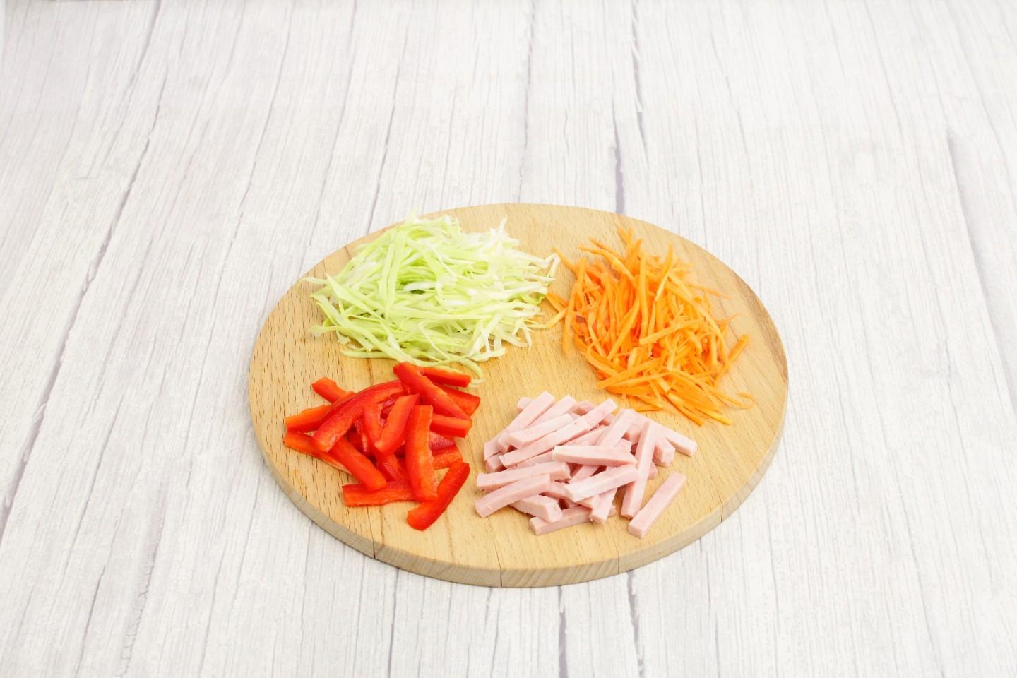 Болгарский перец помойте, удалите семена и плодоножку. Нарежьте перец нетолстой соломкой. Морковь очистите, помойте. Я измельчила морковь на терке для корейской моркови. Можно натереть на крупной терке. С капусты удалите верхние поврежденные листья. Капусту помойте, хорошо обсушите, нарежьте тонкой соломкой, убирая при этом плотные и грубые утолщения. Ветчину также нарежьте соломкой. А все тонкости работы с привычной кухонной тёркой - в статье под шагами.
