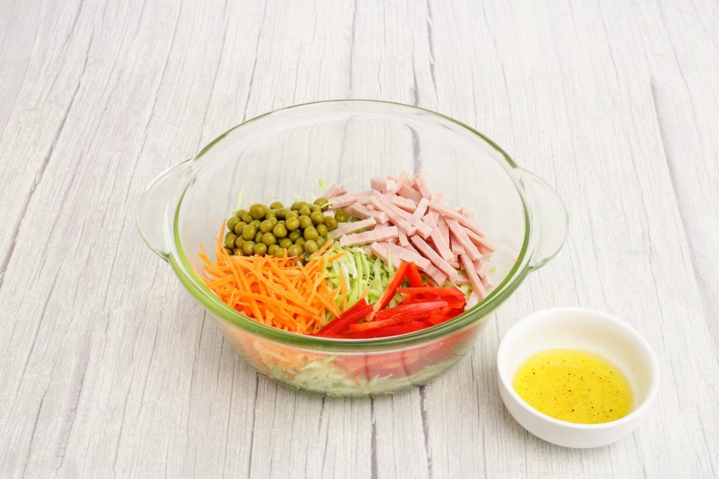В миску выложите подготовленную капусту, слегка помните, чтобы она стала сочнее и мягче. Добавьте к капусте болгарский перец, морковь и ветчину. Зеленый горошек достаньте из баночки, процедите от маринада и выложите к остальным овощам. Полейте салат масляной заправкой и хорошо перемешайте.