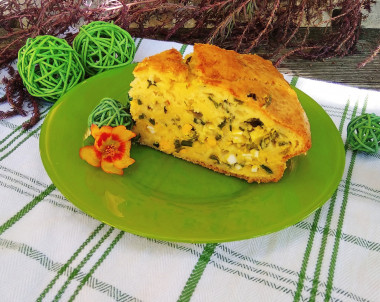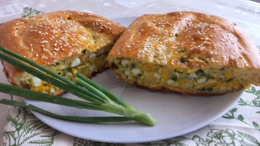 Очень люблю этот пирог. Готовлю его в основном весной, когда появляется первый зеленый лук. Но увидела в ленте рецепт и так захотелось покушать этот вкусный пирожок) Из зелени в огороде осталось немного зеленого лука, петрушка и перья дикого чеснока. Это все и нарезала в начинку. В тесто нужен был кефир, но у меня жирная простокваша, она была бы тяжеловатой для пирога. Поэтому разбавила ее пополам с молоком. Яиц в тесто взяла на одно меньше, тем более они были очень крупные. Тесто получилось густым, тягучим. Форма у меня тоже не большая, пирог вышел высоким. Благодаря разрыхлителю, пирог получился пышным, воздушным, пористым. Нарезала пирог после остывания. Кстати, панировочные сухари очень помогли при вынимании пирога. Кусочки не разваливаются, хорошо держат форму. Пирог очень вкусный, яркий, эдакое солнышко среди осени)