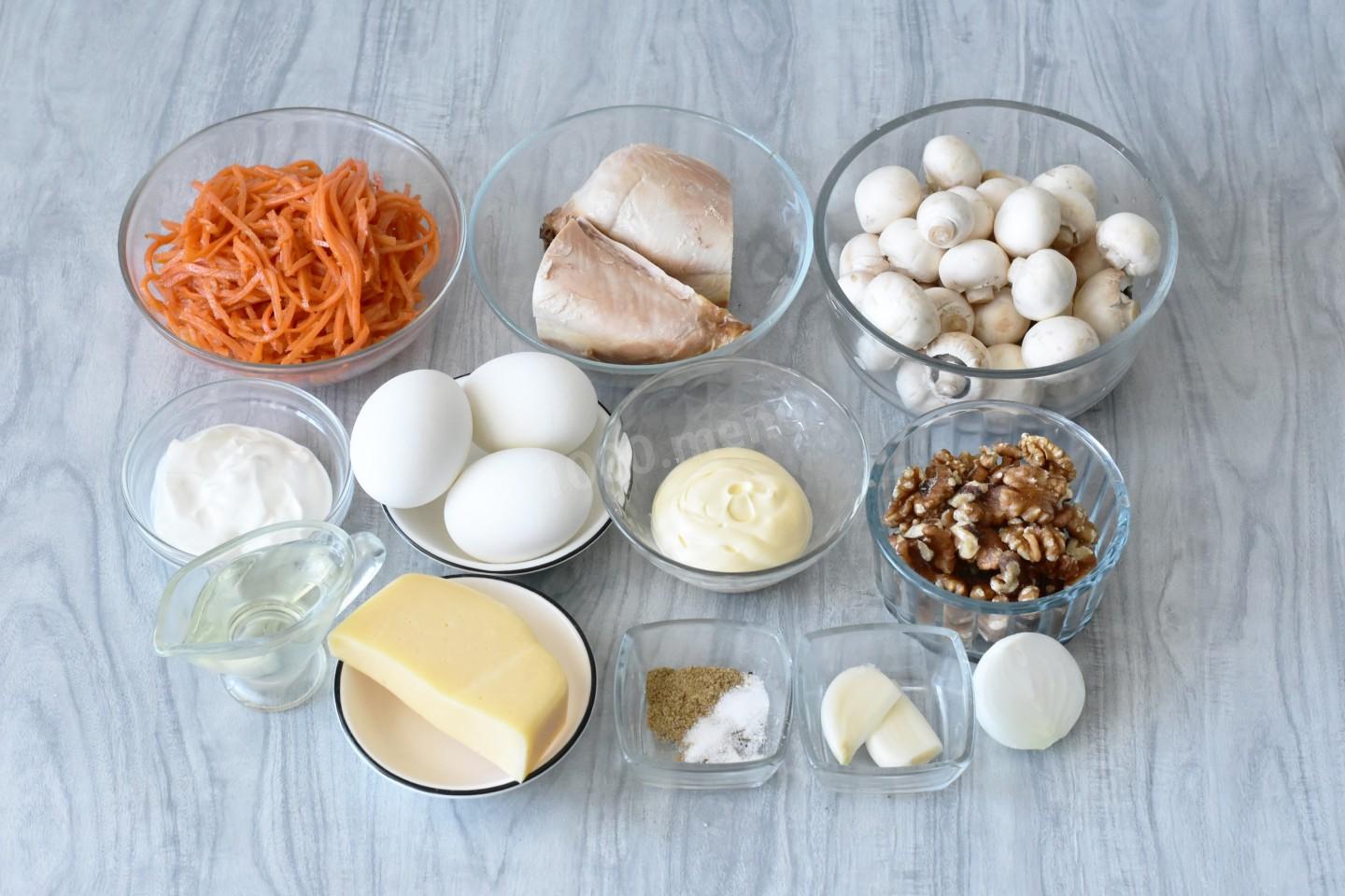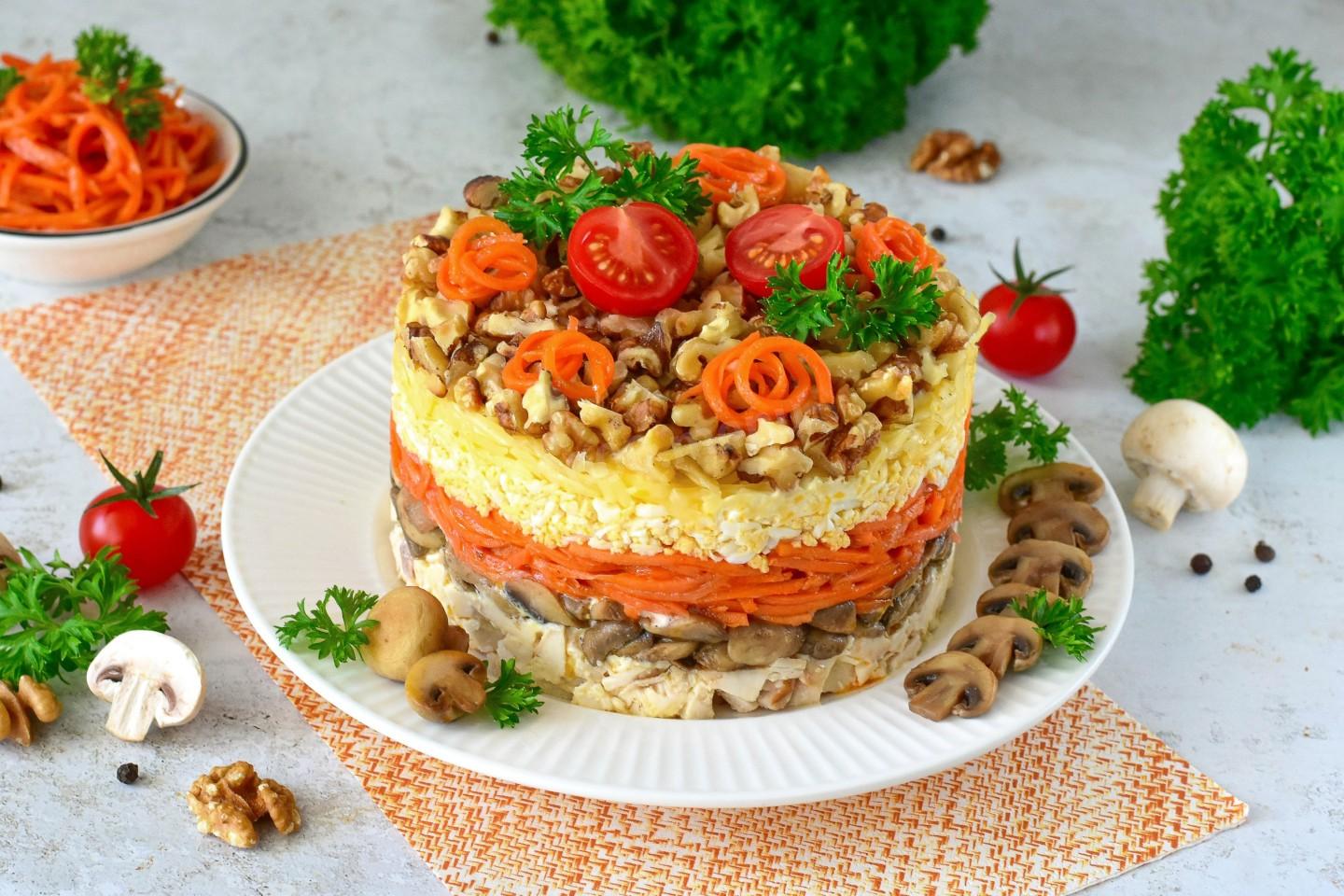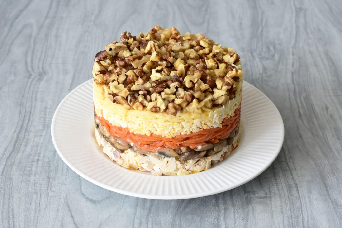 На блюдо установите кулинарное кольцо (я взяла Ø 14-15 см) и выложите слоями, промазывая тонким слоем майонеза со сметаной, копченую курицу, жареные с луком грибы, морковь по-корейски, вареные яйца и тертый сыр. Или можете собрать салат в стеклянной салатнице, чтобы были видны слои. Посыпьте салат грецкими орехами и уберите на 1-2 часа в холодильник для пропитки. После того как салат хорошо пропитался, аккуратно снимите кулинарное кольцо.