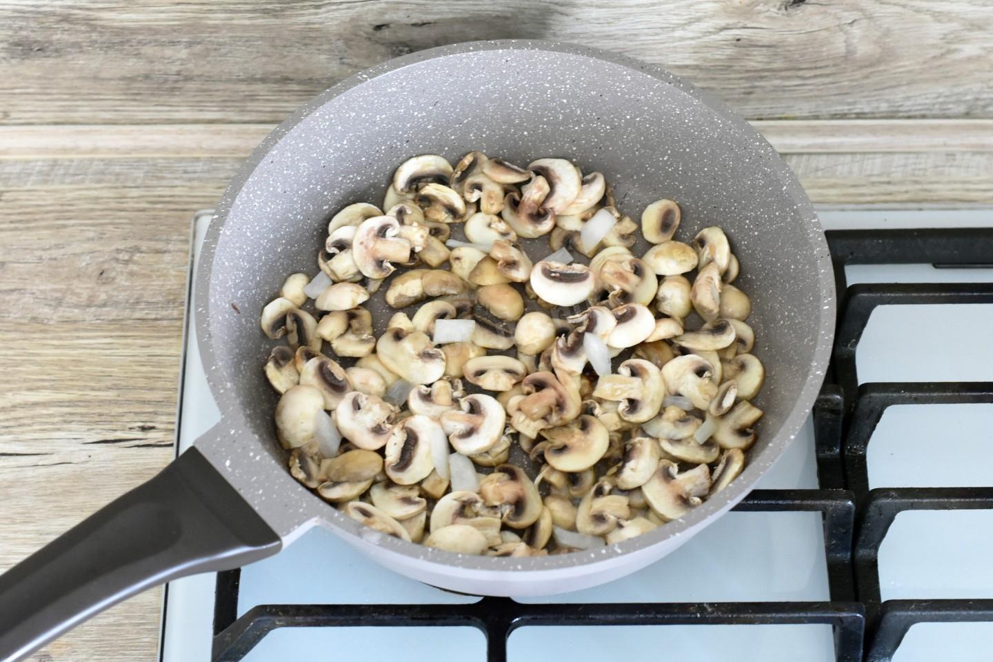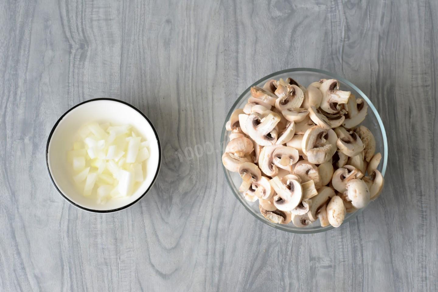 Шампиньоны вымойте, обсушите и нарежьте пластинками. Лучше берите мелкие грибочки. Если используете замороженные грибы, то берите их с запасом, раза в полтора больше, потому что при размораживании и обжаривании их останется буквально горсточка. Лук очистите от шелухи, промойте, обсушите и нарежьте кубиками. Перед нарезкой лук и нож ополосните холодной водой - это уменьшит раздражение глаз. Чтобы доска не впитала запах лука, протрите её долькой лимона.