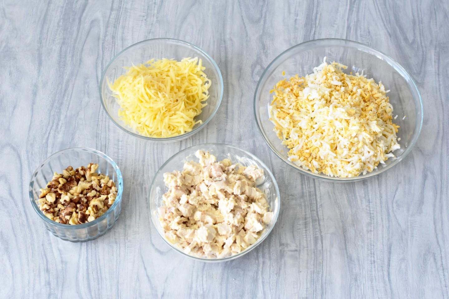 Яйца сварите вкрутую, охладите и очистите. Натрите на крупной терке. Копченую курицу нарежьте мелкими кубиками. Смешайте курицу с 1 ст. л. майонеза и пропущенным через пресс чесноком. Грецкие орехи прокалите на сухой сковороде и крупно порубите. Сыр натрите на крупной терке. Сыр подойдет твердый или полутвердый, качественный, без заменителей молочных жиров. О различных видах сыров и работе с тёркой читайте в статьях в конце рецепта, после шагов.