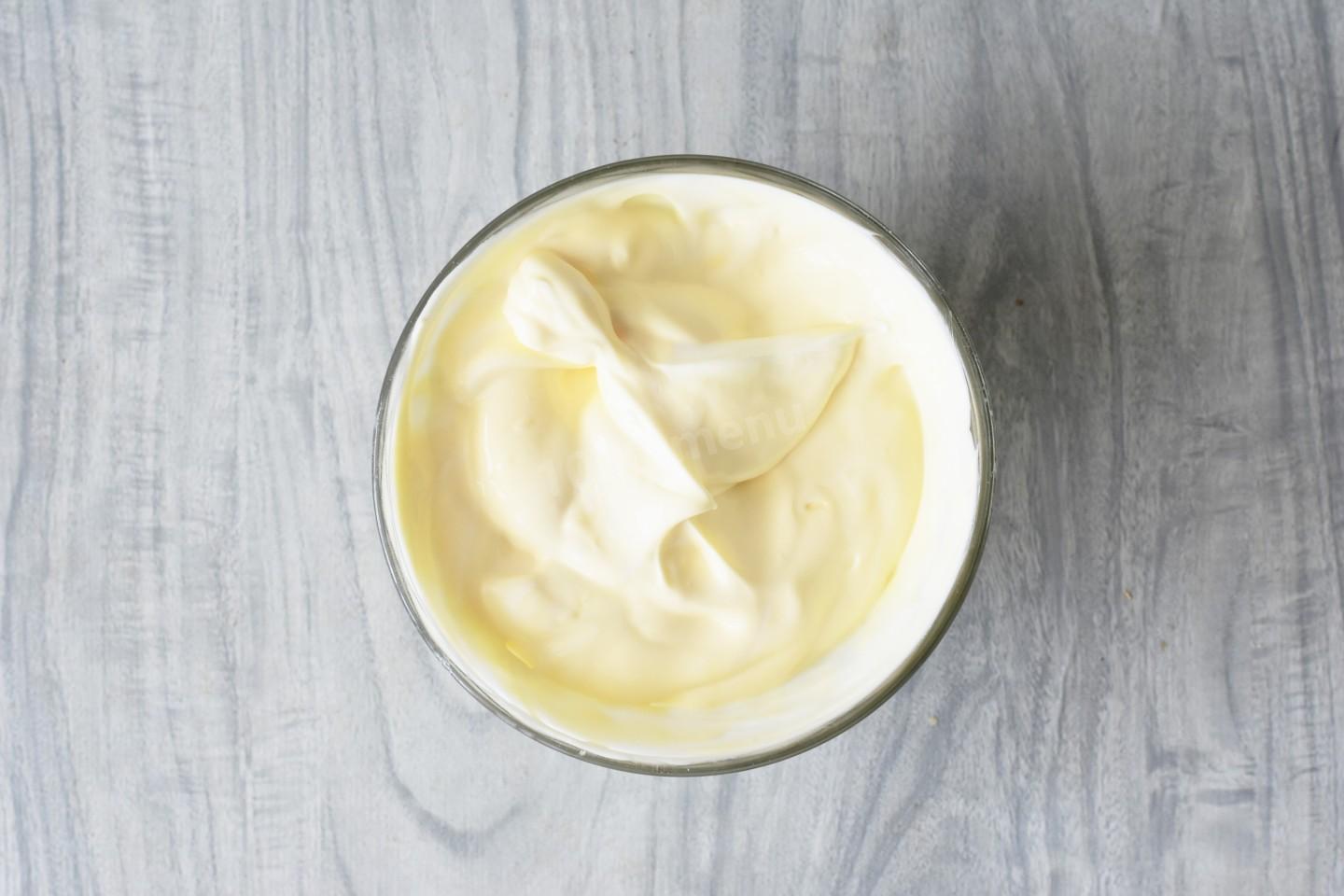 Оставшийся майонез соедините со сметаной и перемешайте до однородности. Можете использовать просто майонез без сметаны. Майонез можете сделать самостоятельно. Рецепты домашнего майонеза вы найдёте после последнего шага. Для пикантности можете добавить 1 ч. л. горчицы или соуса чили.