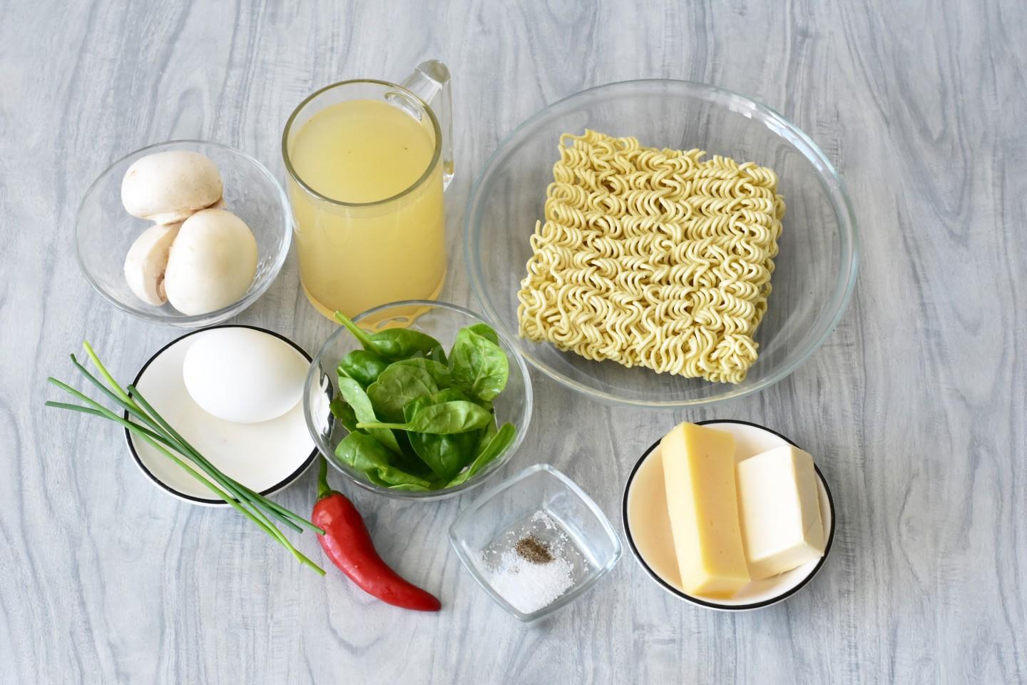 Подготовьте необходимые ингредиенты по списку. Можете взять любую лапшу быстрого приготовления. Если найдете специальную лапшу для приготовления супа Рамен, то можете вместо куриного бульона сделать бульон со специями из упаковки. Листья шпината вымойте, обсушите. Для рецепта лучше берите мелкий шпинат. Если используете замороженные грибы, то берите их раза в полтора больше.