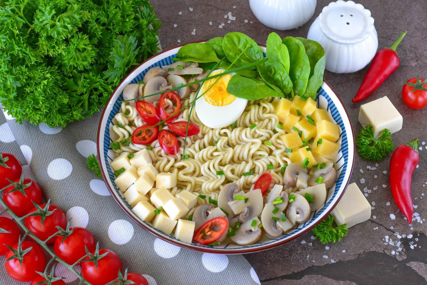В тарелку с лапшой выложите шампиньоны, два вида сыра, шпинат, половинки яйца, чили и зеленый лук. Сразу подавайте лапшу рамен с сыром к столу. Приятного аппетита!