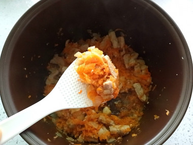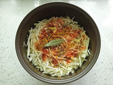 Слегка разморозила свиной карбонад и нарезала его брусочками. Мультиварку включила на программу "жарка" на 20 минут. За это время сначала обжарила мясо, затем добавила лук с морковью. Сверху загрузила нарезанную капусту и влила разведенную томатную пасту. Из специй у меня паприка, приправа для мяса, сушеный укроп и лавровый лист. Тушила я дольше, 1,5 часа из-за того, что капуста оказалась ну очень жесткой. Молодая капуста будет готова гораздо раньше.