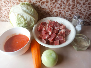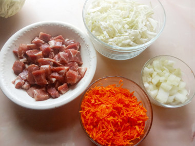 Как сделать тушеную капусту с мясом в мультиварке? подготовьте для этого необходимые ингредиенты. Мясо можно использовать любое - говядину, курицу, индейку или, как у меня - свинину.