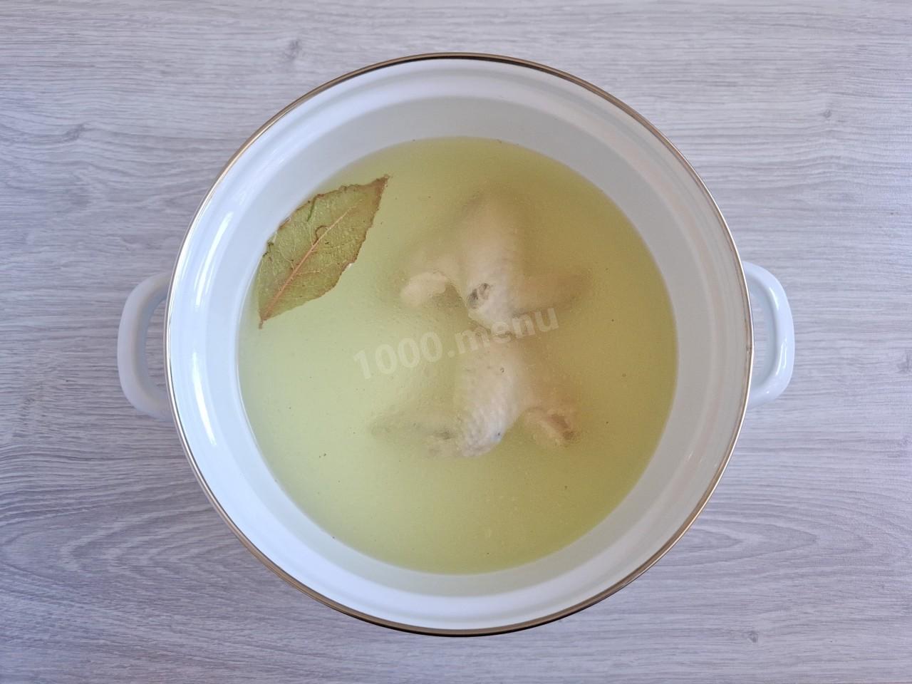 Промойте кусочки курицы в холодной воде и переложите их в кастрюлю. Влейте холодную чистую воду и добавьте лавровый лист по желанию. Доведите бульон до кипения на среднем огне, затем нагрев убавьте и варите приблизительно 20 - 25 минут. Время зависит от особенностей работы вашей плиты и размеров кусочков. Затем курицу и лавровый лист уберите, а бульон процедите. О том, как подобрать кастрюлю читайте в статье по ссылке под описанием рецепта.