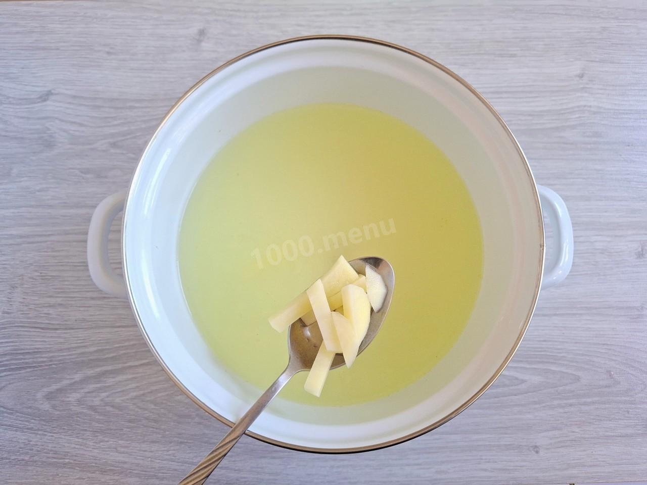 Бульон или воду доведите до кипения и выложите в него нарезанную картошку. Затем нагрев убавьте и варите примерно 12 - 15 минут до мягкости картошки.