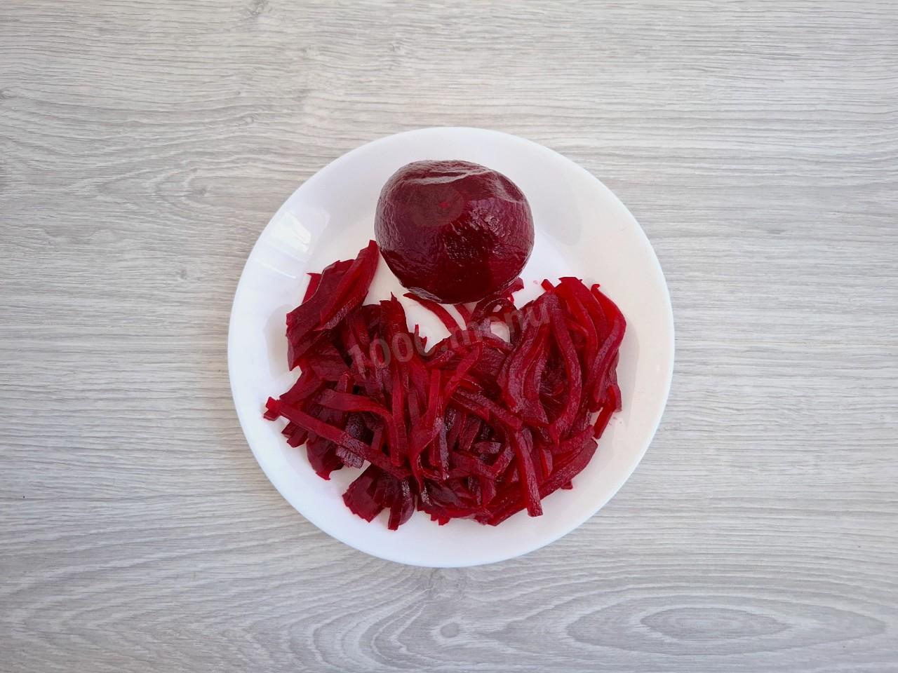 Свеклу тщательно промойте в проточной воде, затем отварите до готовности, на это уйдет примерно 1 - 1,5 часа в зависимости от размеров свеклы и особенностей работы вашей плиты. Затем свеклу остудите, очистите и нарежьте тонкой соломкой. По желанию свеклу можно натереть на терке с крупными зубцами. Информацию о приготовлении свеклы вы можете найти по ссылке после описания рецепта.