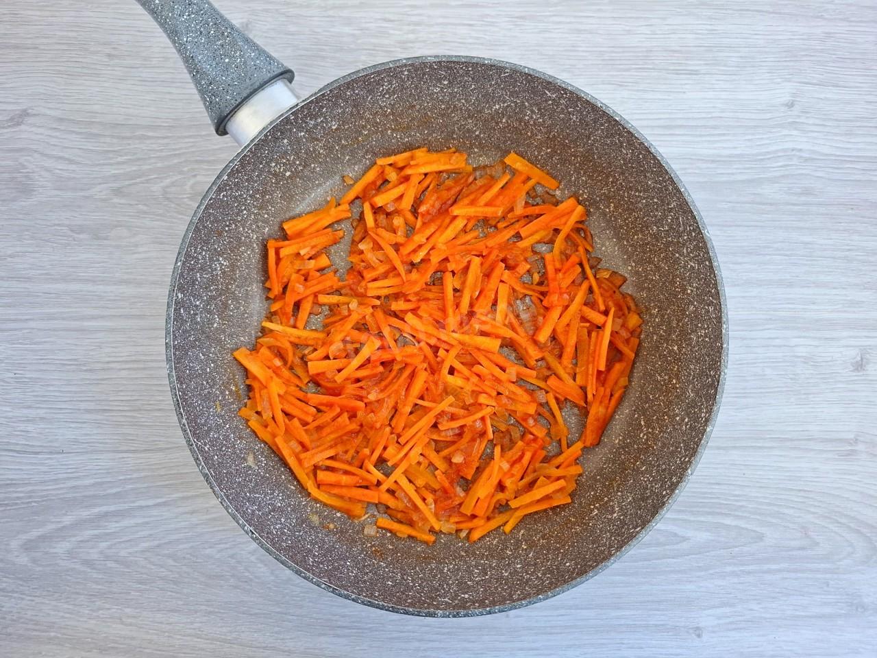Морковь вымойте и очистите от кожуры, затем нарежьте тонкой соломкой. Луковицу очистите от шелухи и нарежьте небольшими кубиками. Сковороду с маслом нагрейте на среднем огне и выложите овощи. Обжаривайте около 3 - 4 минут. Затем добавьте томатную пасту и немного бульона. Потушите овощи еще примерно 5 - 7 минут. С выбором сковороды вам поможет статья по ссылке под описанием рецепта. Картошку помойте, очистите от кожуры и нарежьте небольшими брусочками.