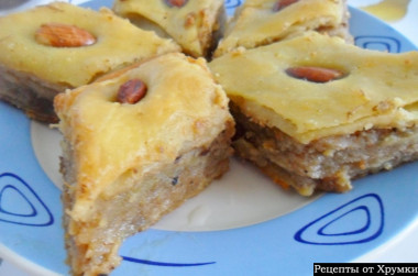 Пахлава получилась очень вкусной! Только вот я готовила сразу на 2 порции, чтобы полностью заполнить всю форму для выпечки. По времени потратила 1,5 часа (долго раскатывать каждый слой теста)