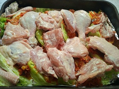В подходящую по размеру форму выложите капусту, а сверху распределите маринованную курицу. В процессе запекания капуста осядет и её объём уменьшиться почти в два раза.