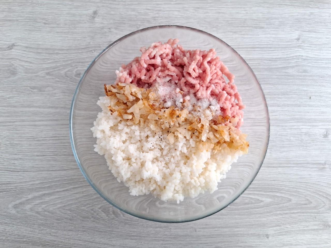 Мясо промойте в холодной воде, обсушите и нарежьте небольшими кусочками. Пропустите мясо через мясорубку. Можно взять уже готовый фарш. В миску с фаршем выложите остывший рис и жареный лук, посолите по вкусу. Начинку тщательно перемешайте.