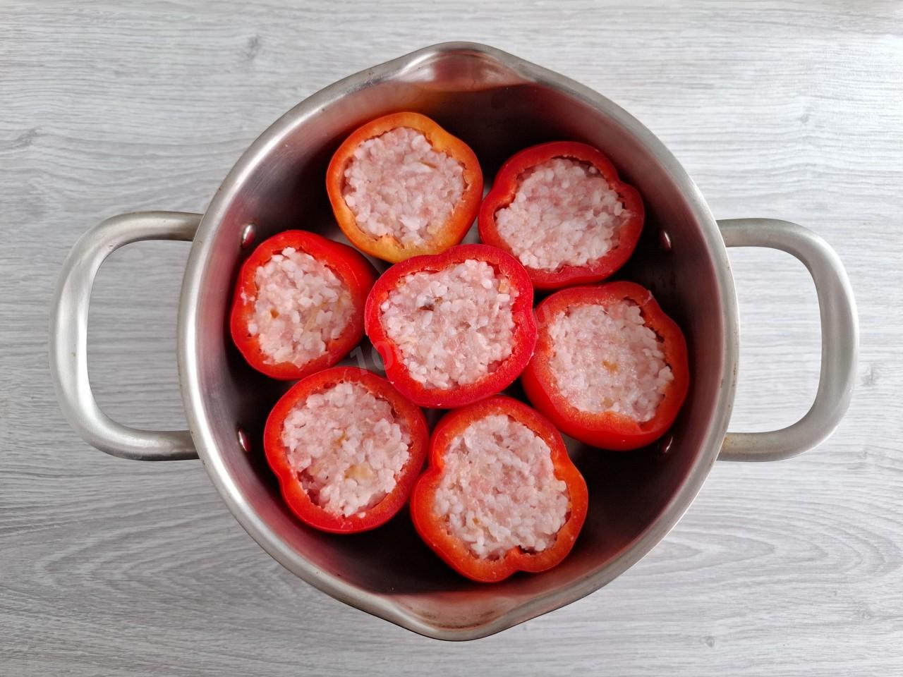 Перцы вымойте, срежьте хвостики и вычистите изнутри семена и перегородки. Количество перчиков берите, ориентируясь на размеры своей кастрюли. О том, как подобрать кастрюлю читайте в статье по ссылке под описанием рецепта. Наполните каждый перец начинкой с помощью ложки и вертикально поставьте в кастрюлю.