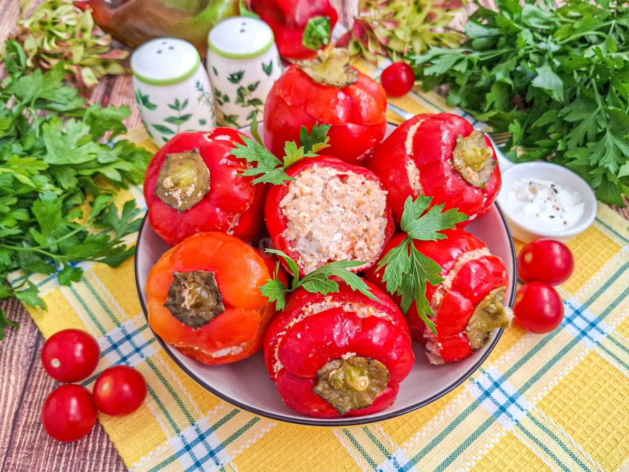 Подавайте фаршированные перцы горячими, полив их сверху соусом, в котором они тушились. Классическое дополнение — свежая сметана и рубленая зелень укропа или петрушки. Блюдо самодостаточно, но отлично сочетается с ломтем свежего хлеба или легким овощным салатом.
